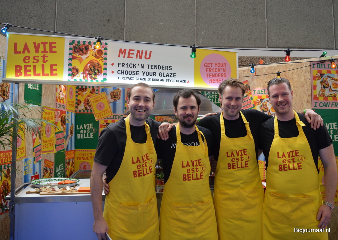 La Vie est Belle presenteerde Frick'n Tenders, een nieuwe vleesvervanger op basis van seitan. Op de foto: Jan Padberg, Karel Derave, Lieven Derave en Matthias Blanckaert.