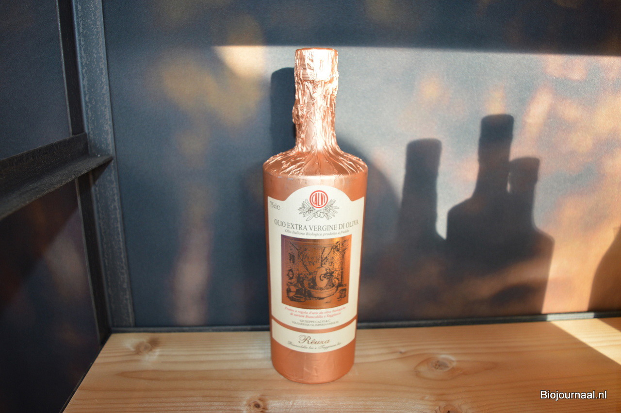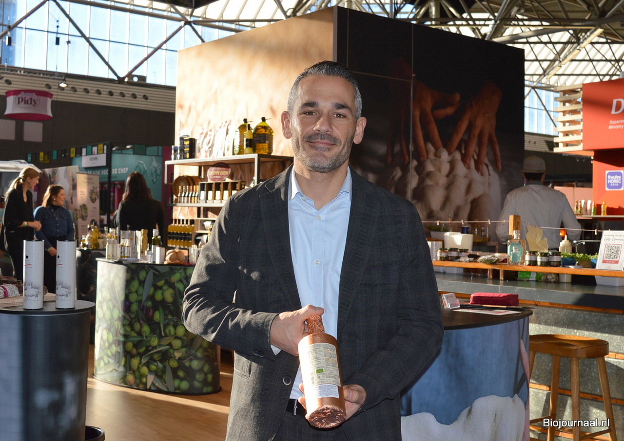 Carlo Moro met een nieuwe biologische olijfolie die bij Mercato Italiano verkrijgbaar is, van het merk Calvi.