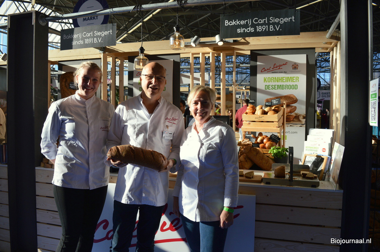 Bij Bakkerij Carl Siegert tonen Britt van der Beek, Carl Siegert en Corry Luijendijk het nieuwe brood: Kornheimer desembrood.