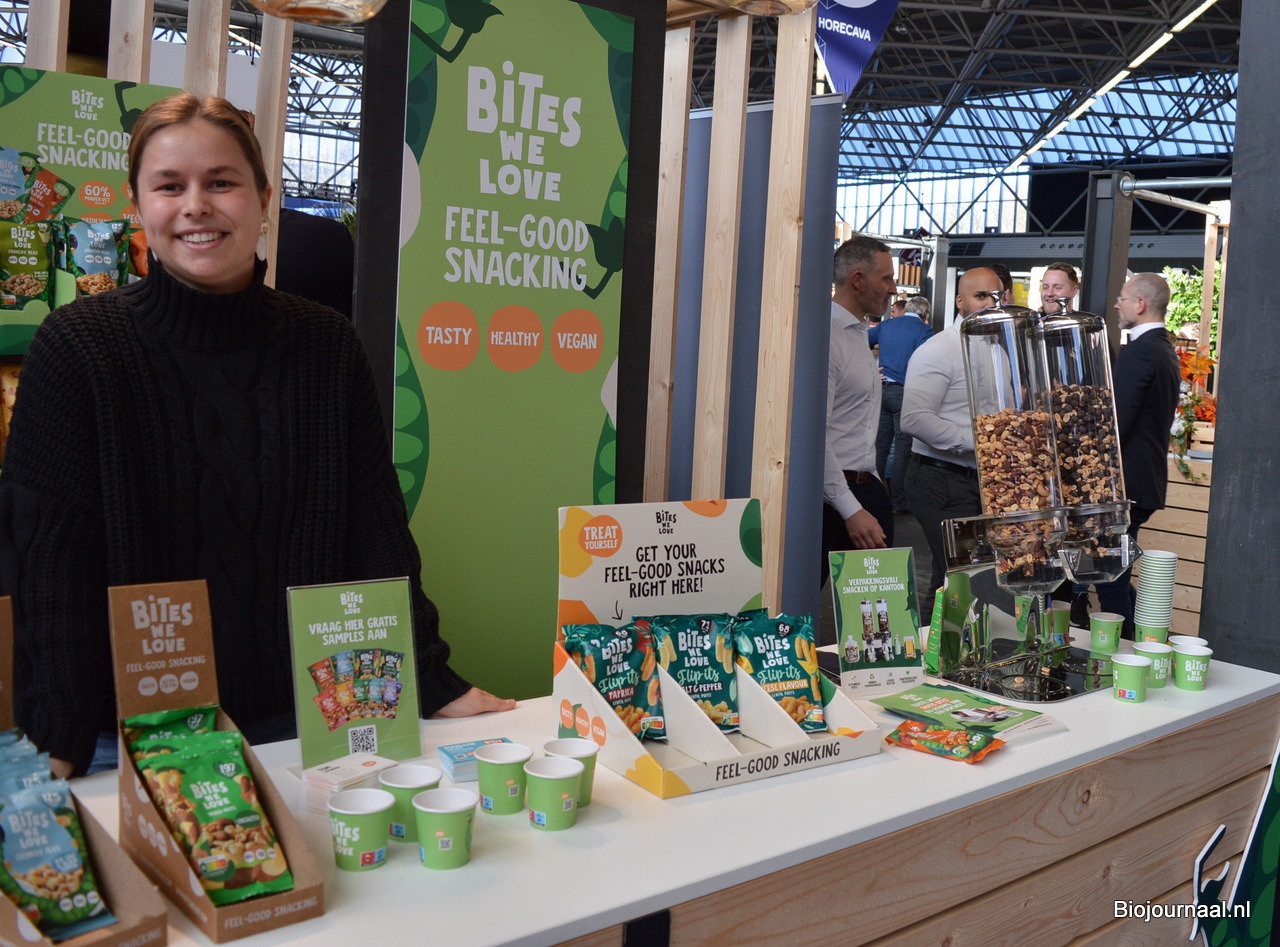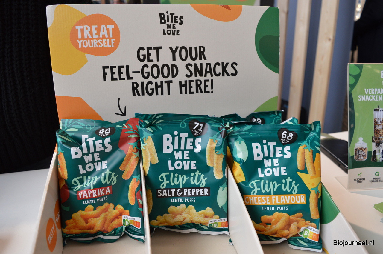 Lara Zwart bij BitesWeLove. Zij introduceerden in 2022 biologische linzenchips: Flip-its.