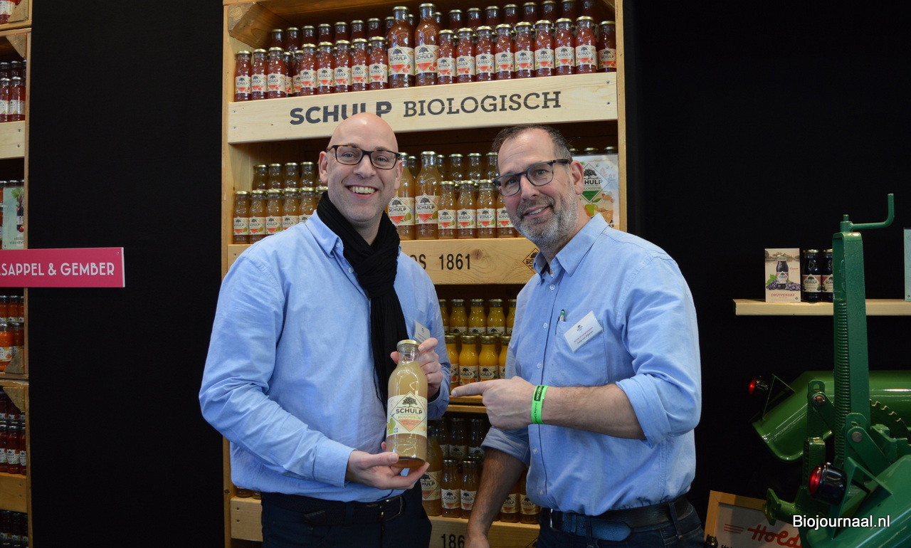 Frederik de Koning en Jaap van Pijkeren bij de kast vol biologische sapjes van Schulp Vruchtensappen.