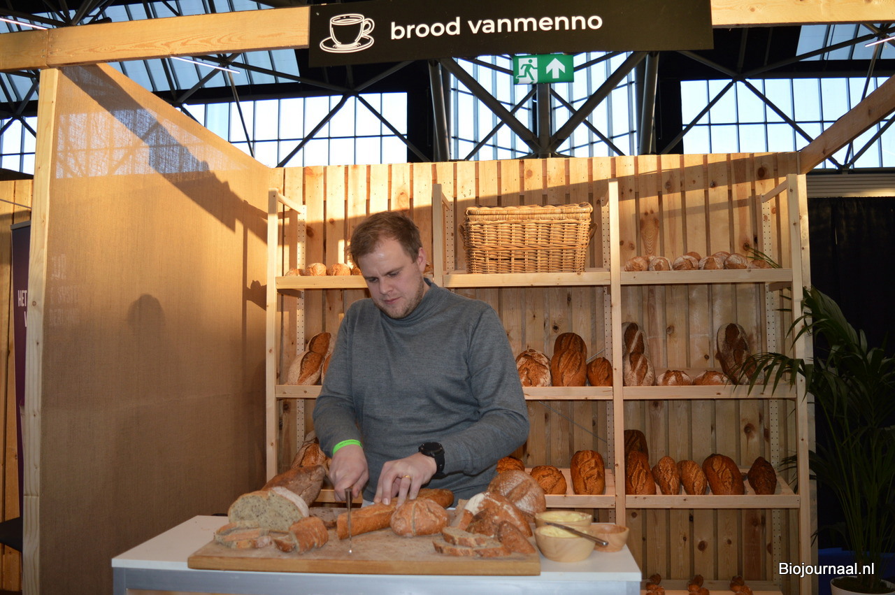 Willem Plaisier snijdt wat vanmenno-brood. Duidelijk te herkennen aan het karakteristieke Franse uiterlijk. "Dit is onze eerste keer hier. Telkens wanneer ik een bezoek bracht aan de Horecava vond ik het een gemis om hier niet te staan."