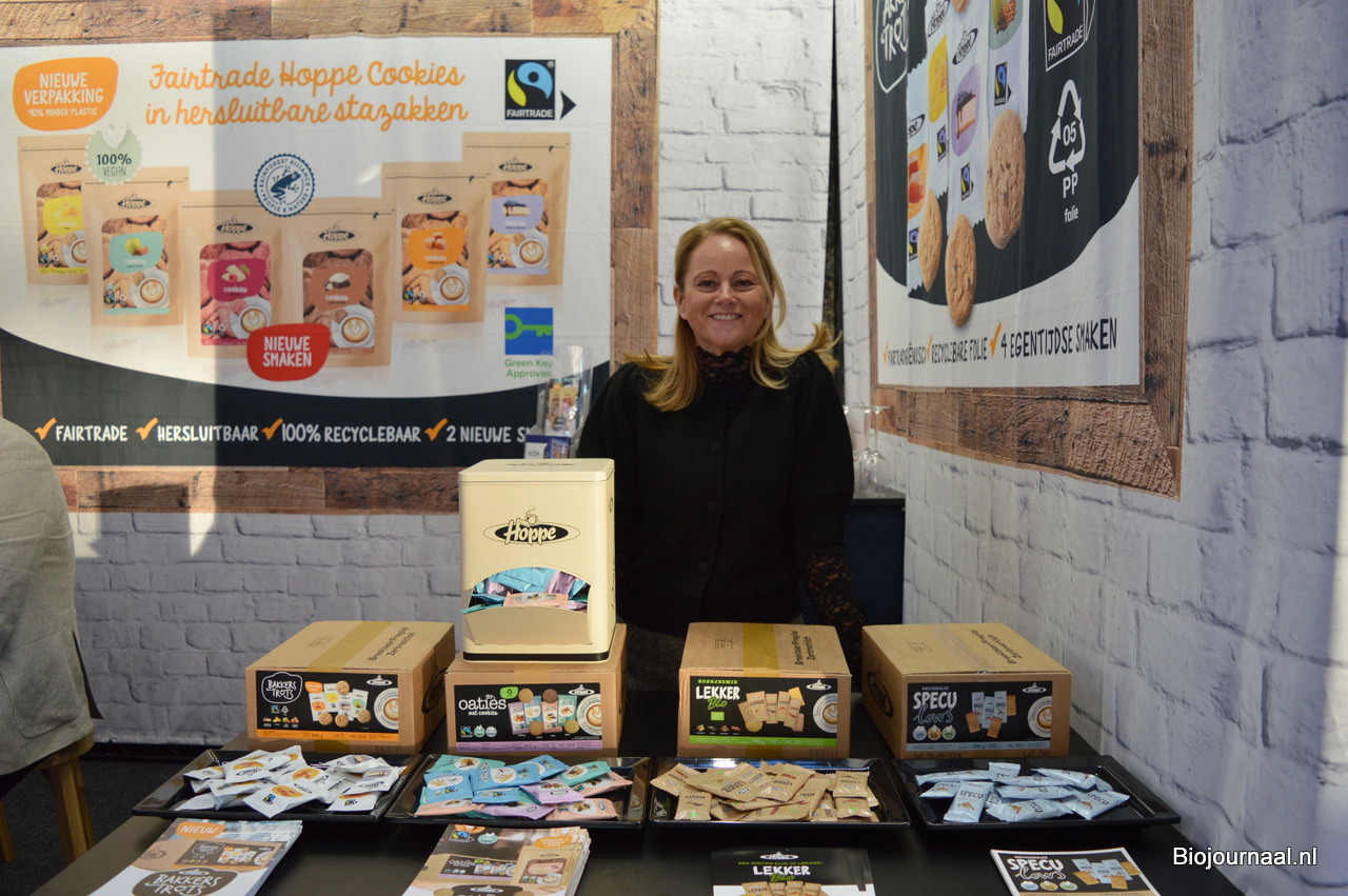 Sylvia van Wijk met voor haar de biologische koekjes van Hoppe Professional.