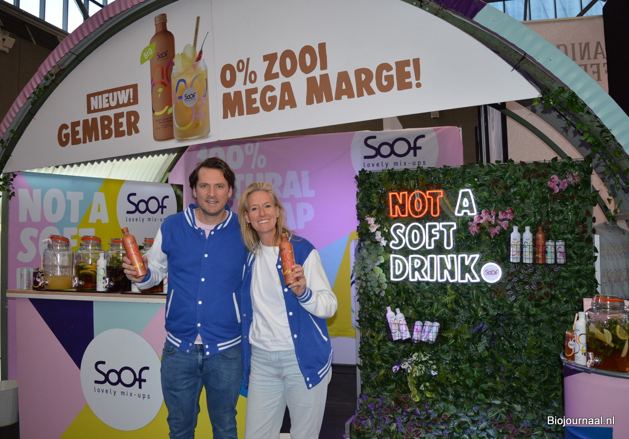 Soof Drinks stond niet alleen in half 7, maar was ook te vinden in hal 12. Op de foto Daan Harterink en Nicole Horsmans, de eigenaren van het siroop- en limonademerk.