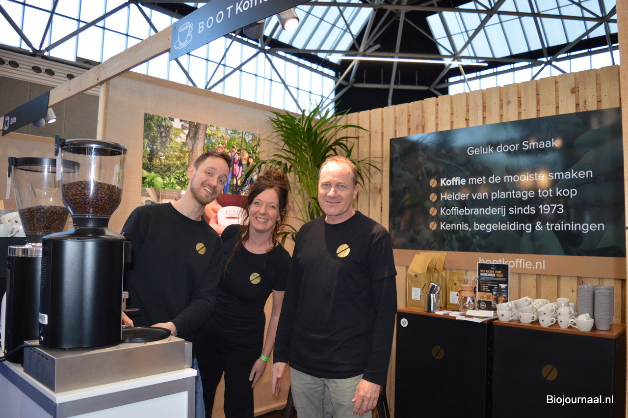Bij BOOT Koffie: Alejandro Stalpers, Darja Koster en Vincent van Dijk. Vincent: "We hebben al wat leuke gesprekken gevoerd, er komt heel gericht publiek op deze beurs af."