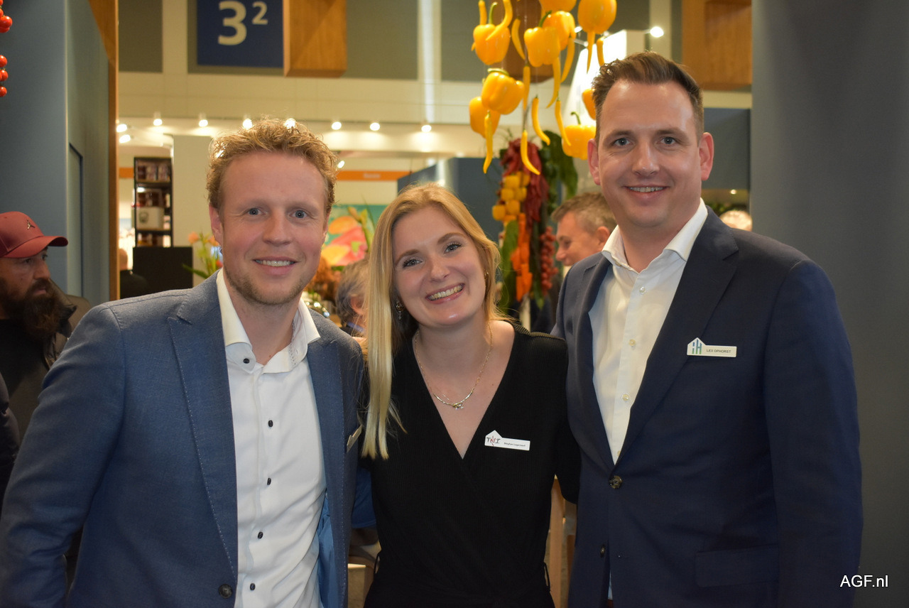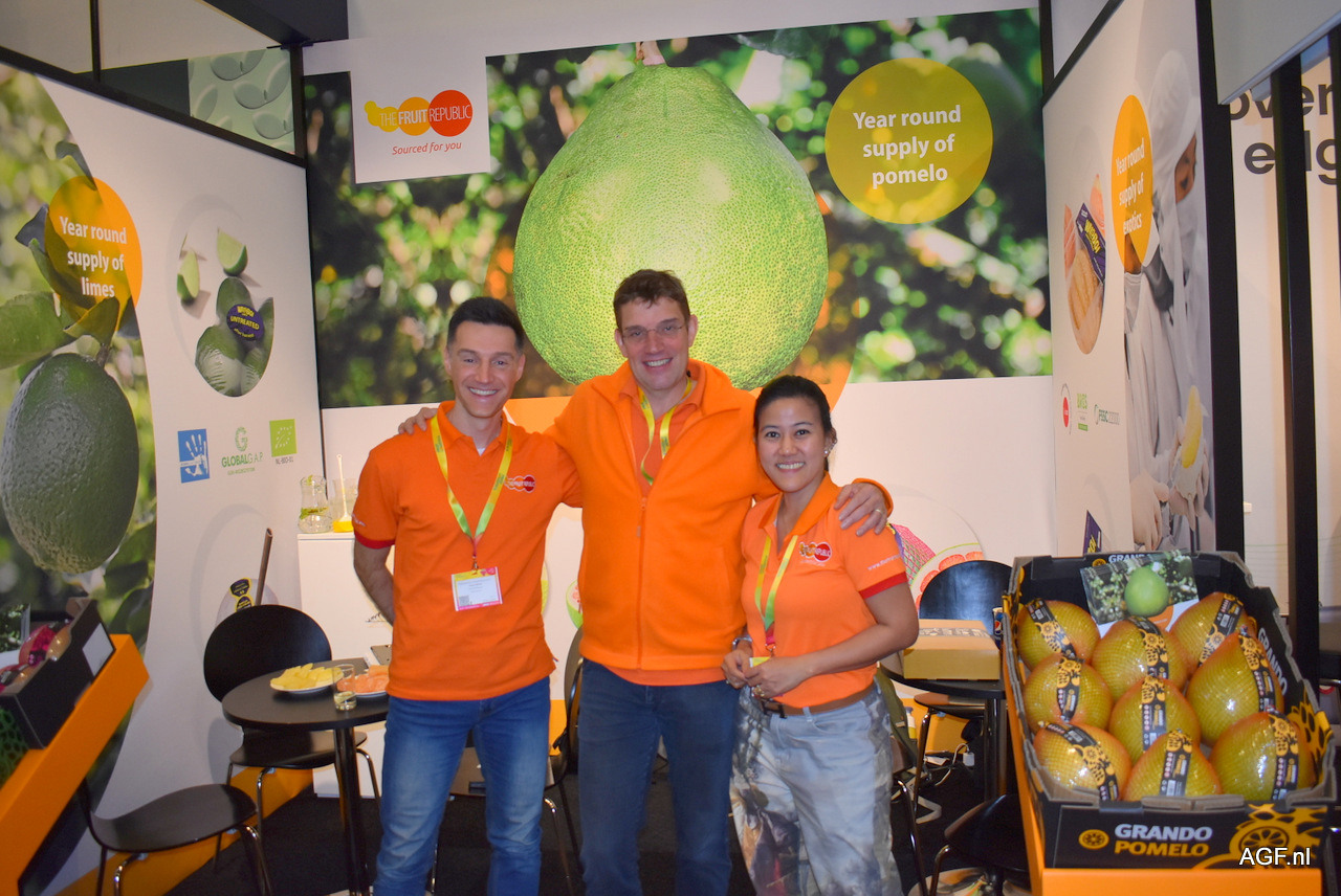 The Fruit Republic stond als Vietnamees bedrijf in de Holland-hal, maar ze kleurden goed oranje. Vlnr Jeroen Pasman, Siebe van Wijk en Carla Briones. In maart presenteren ze zich in Vietnam aan het Koninklijk paar en een vijftal Nederlandse ministers die op handelsmissie gaan in Vietnam