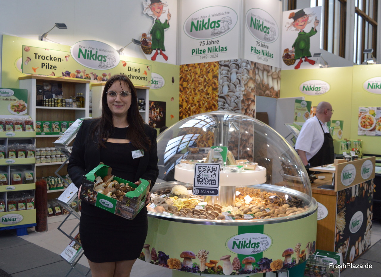 Lisa Niklas van het gelijknamige Beierse familiebedrijf presenteerde een breed assortiment verse, gedroogde en diepgevroren champignonproducten. Op de foto toont mevrouw Niklas een mengsel van Chinese Morilles en Zuid-Afrikaanse Porcini paddenstoelen.