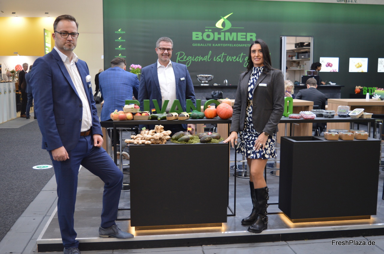 De Böhmer Groep, inclusief de biologische divisie Bivano, presenteerde zich ook dit jaar weer met een kleurrijke stand in het entreegebied van Hal 20, op de foto: Sven Schmitt, Carsten Gogoll (Bivano) en Gabriela Morales.