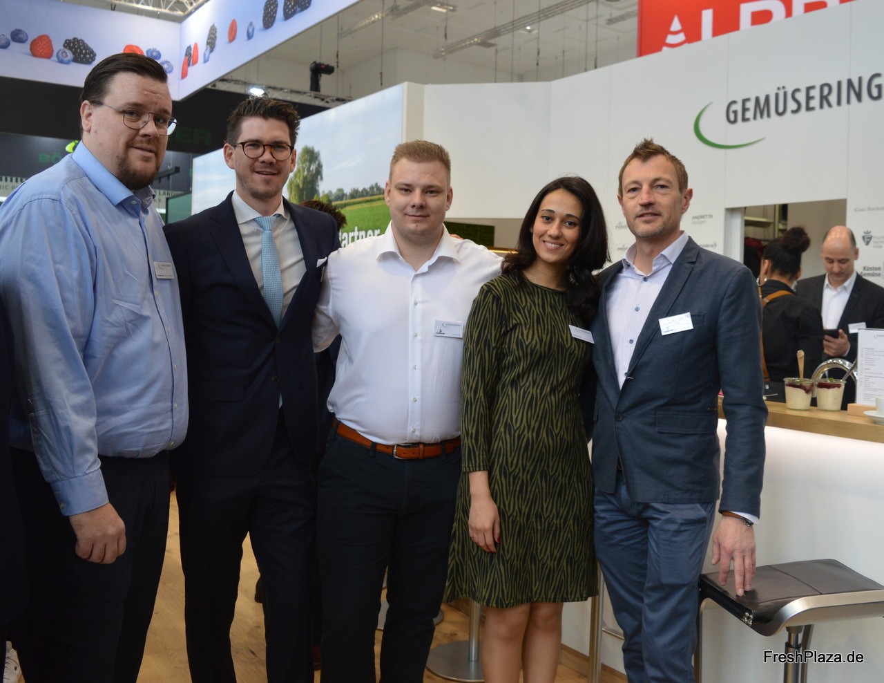Het personeel van Widmann GmbH op de stand van Gemüsering.Het bedrijf is een van de grootste leveranciers van blauwe bessen in Duitsland en heeft productielocaties in verschillende landen. Links op de foto: bedrijfsleider Hans Widmann.