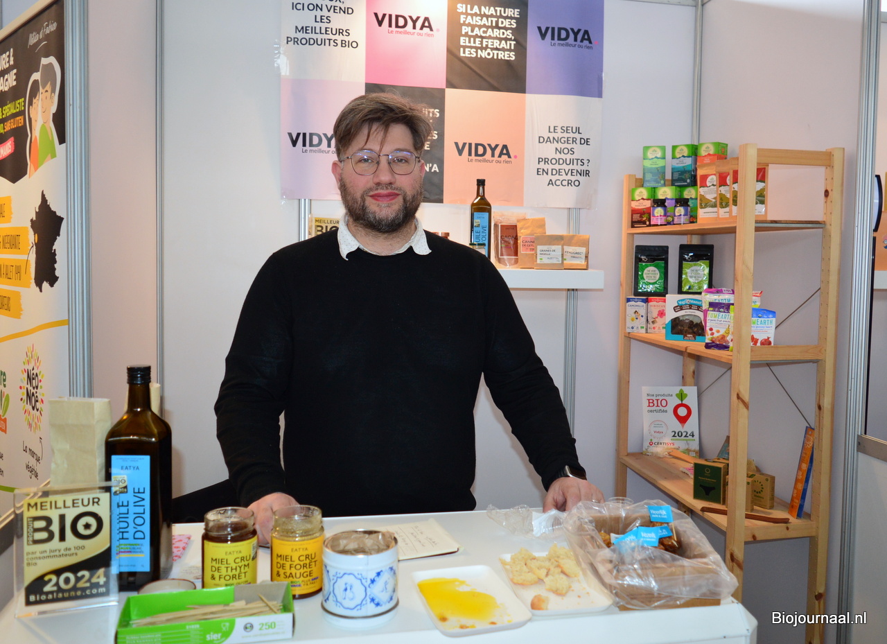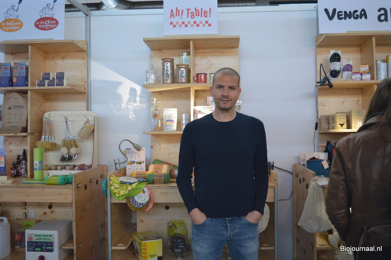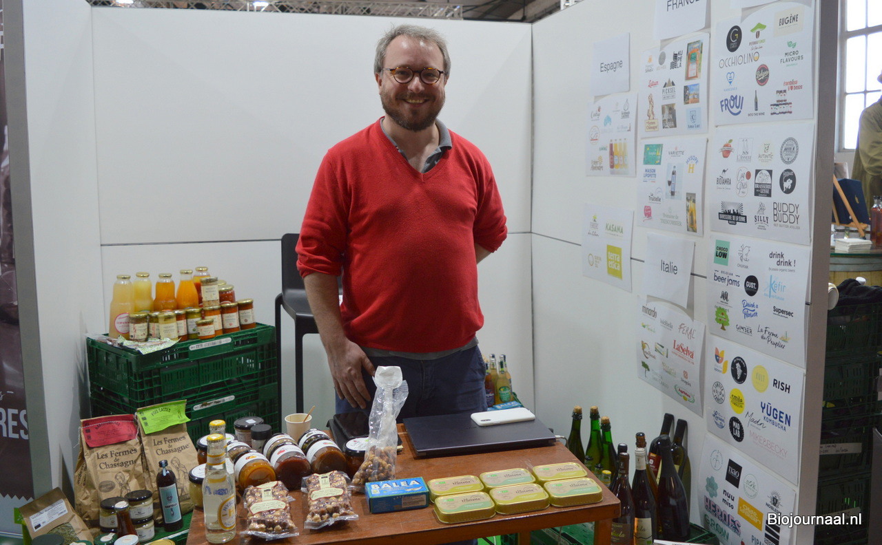 Michaël Riga bij Vajra. De groothandel en verdeler van biologische producten gaf diverse leveranciers de kans om hun producten aan het publiek te presenteren. Michaël: "Het beste is om de producenten zelf over de producten en merken te laten vertellen."