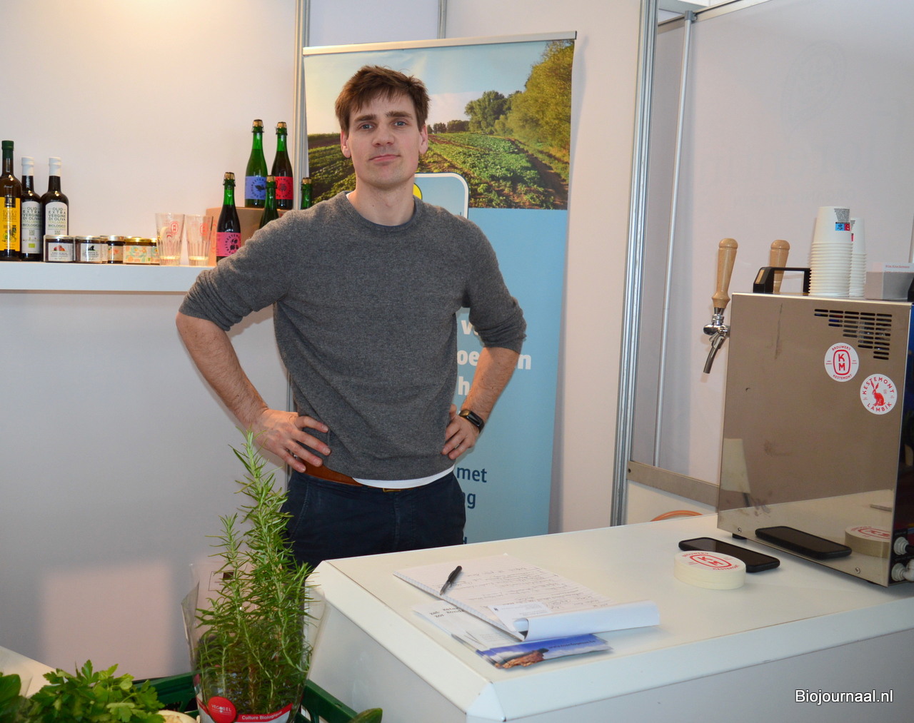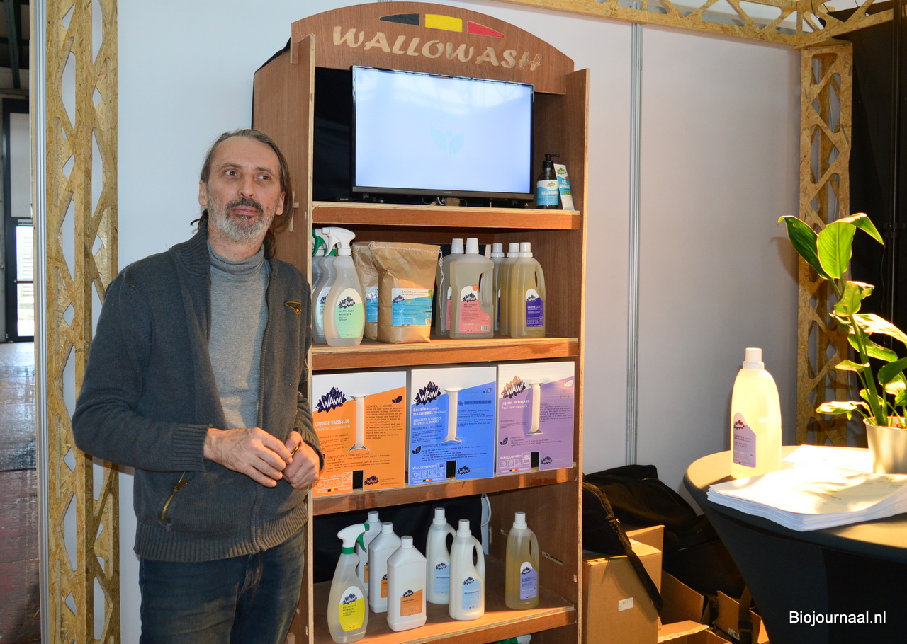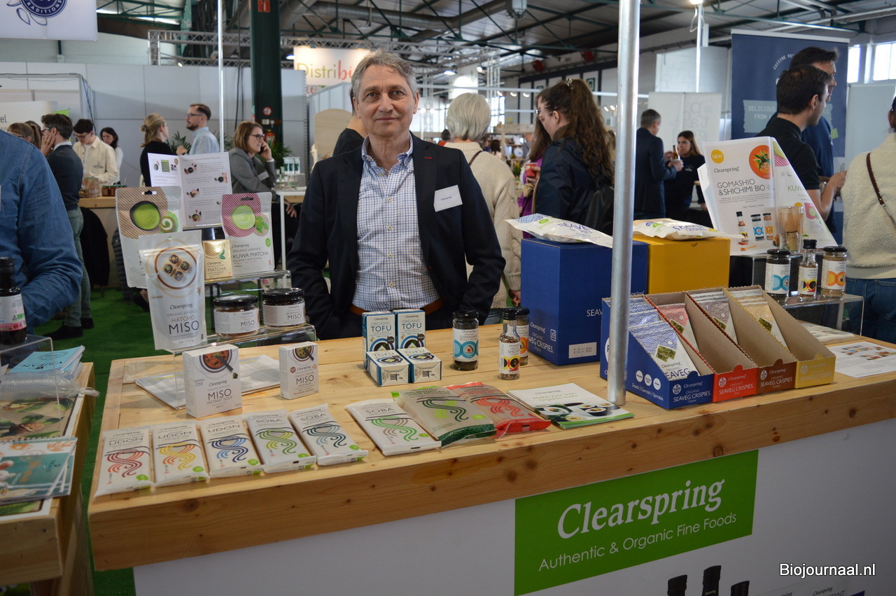 Michaël Riga bij Vajra. De groothandel en verdeler van biologische producten gaf diverse leveranciers de kans om hun producten aan het publiek te presenteren. Michaël: "Het beste is om de producenten zelf over de producten en merken te laten vertellen."
