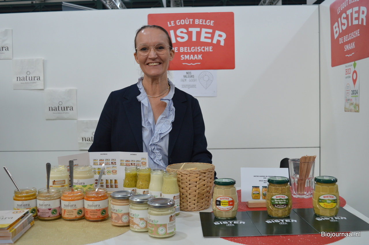 Edith Gomes met de biologische spreads en sauzen van Natura. Rechts de mosterd van Bister. "We scoren zeker met de Belgische herkomst van onze mosterd."