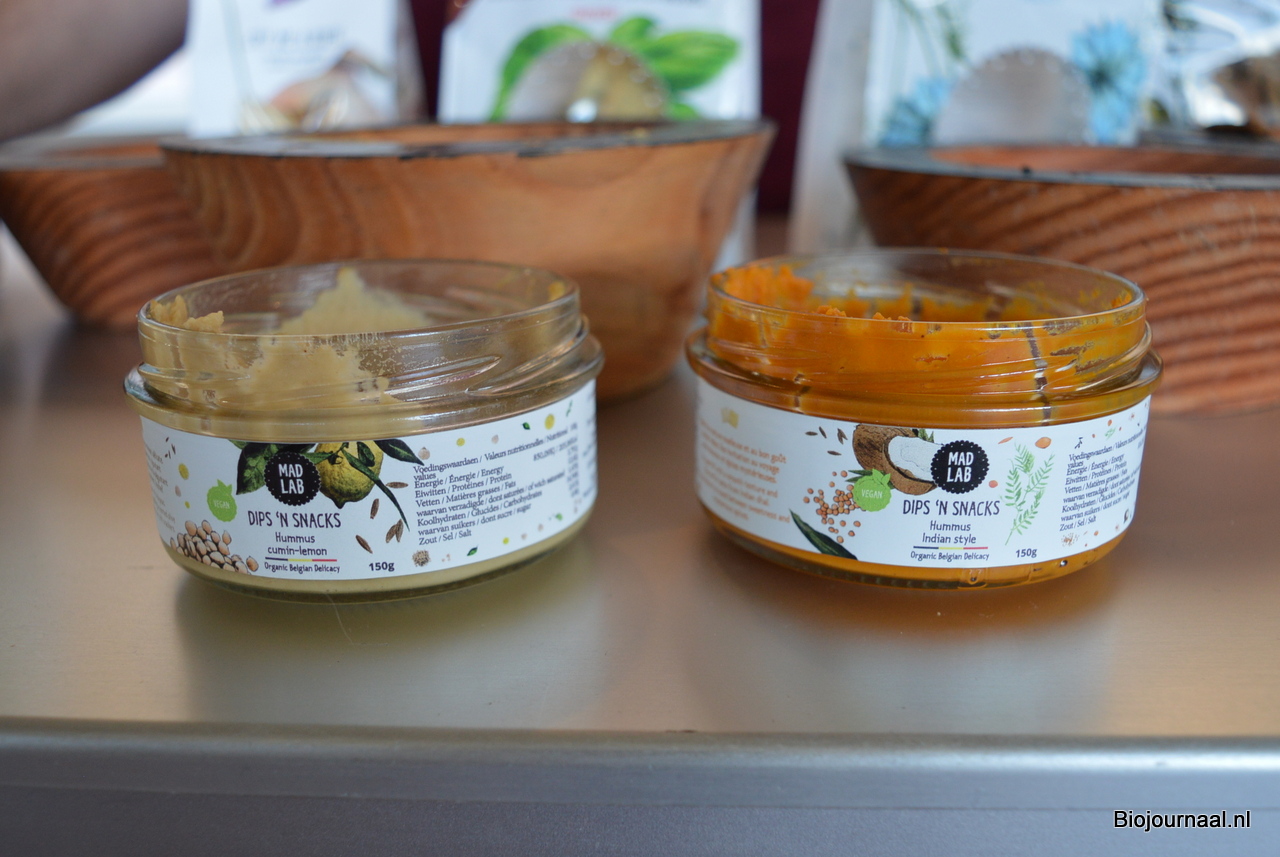 Nieuw van Mad Lab: Dips 'n Snacks, in twee varianten - hummus cumin-lemon & hummus Indian style.