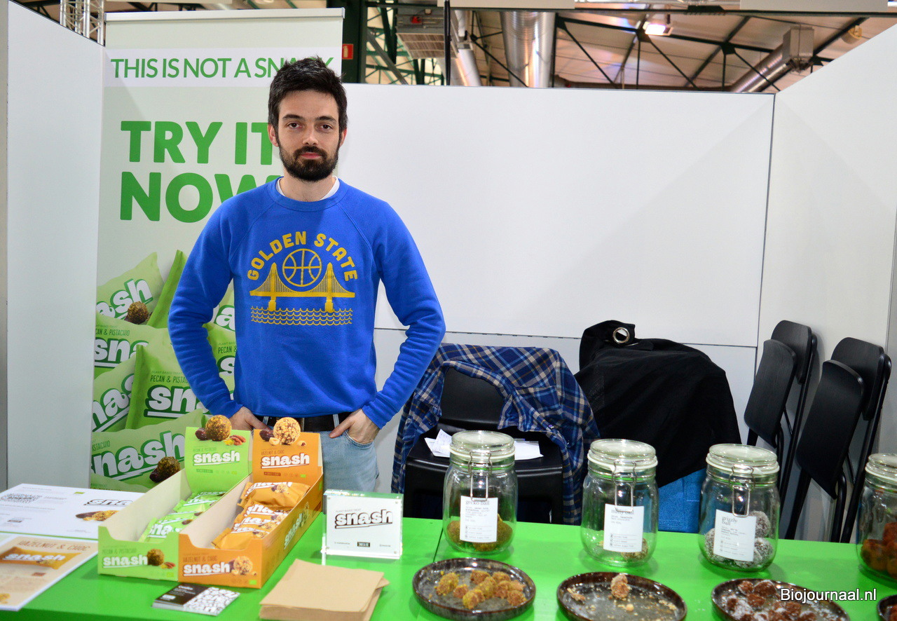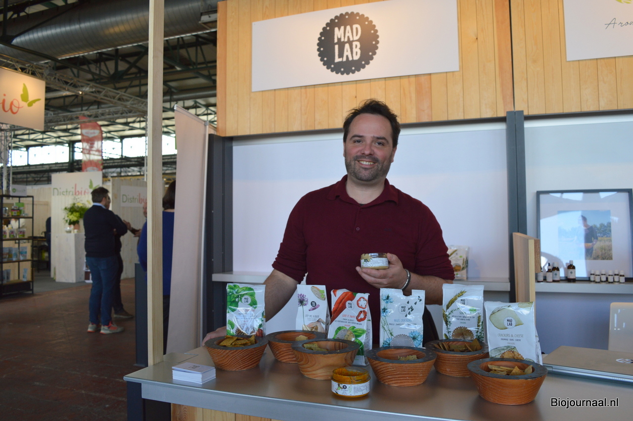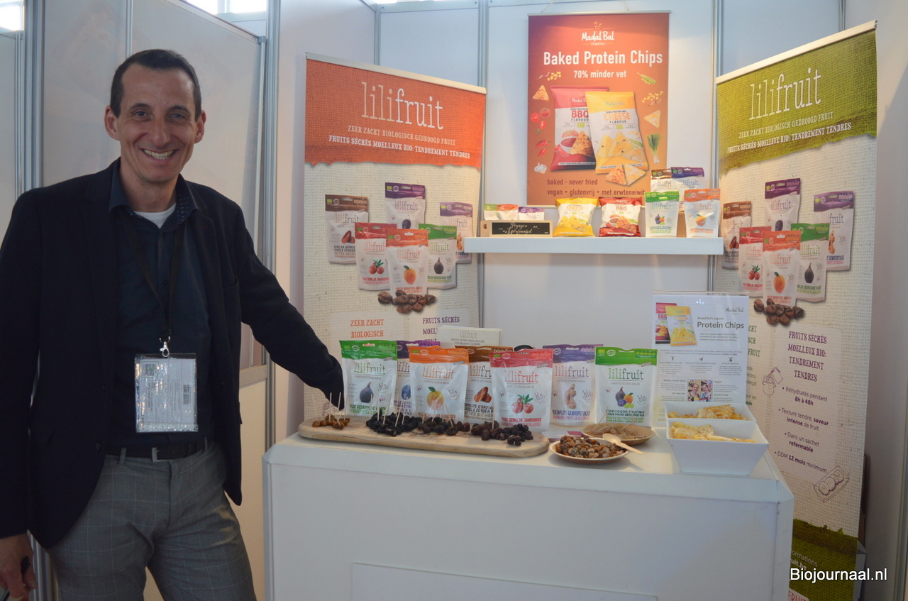 Hans Apontoweil van Fris Gedroogd Fruit, met naast hem de biologische lijn van Lilifruit. Ook schonk hij aandacht aan de proteïnechips van Madal Bal.