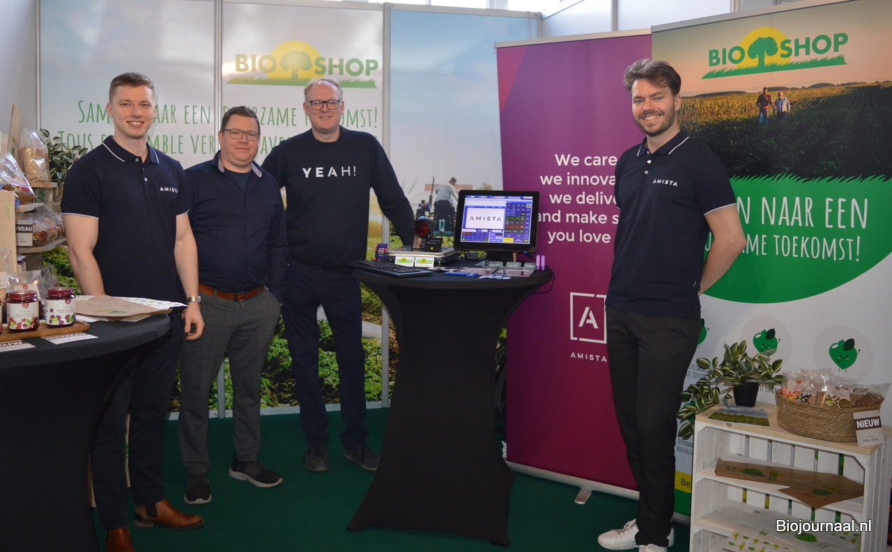 Hoe zal Marma samen met Bioshop winkeliers het verschil gaan maken? Daarover was uiteraard ook meer informatie te verkrijgen in de stand. Jenci Vanhove (Amista), Steve Portauwe (Marma), Kristof Depuydt (Amista) en Michiel Schepers (Amista).