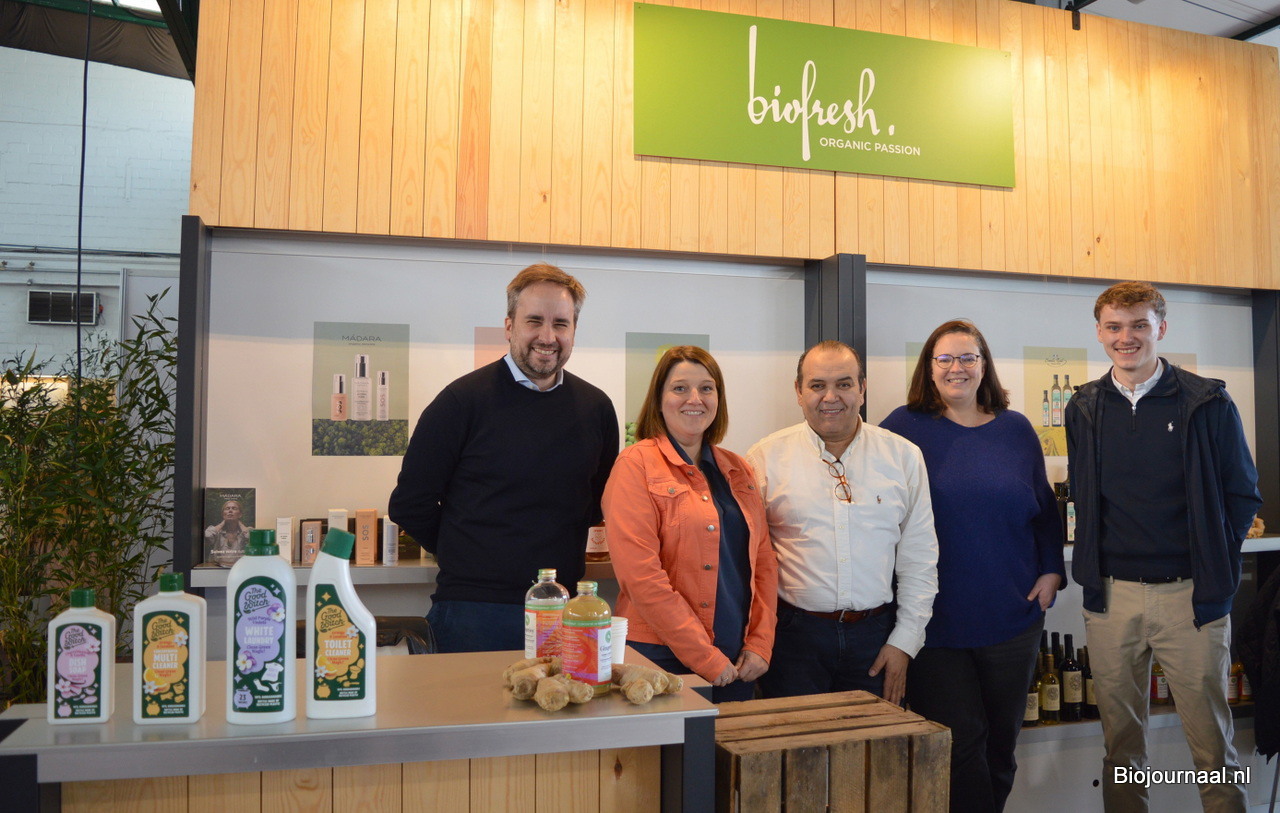 Bij Biofresh: Luc Dossche, Wendy Soli, Abdel El Hosni, Emilie Ghobert en Rodolphe Tramasure. Nieuw is onder meer het merk GingerJoy, exclusief voor de natuurvoedingshandel. En links op de voorgrond staat het door Udea ontwikkelde schoonmaakmerk The Good Witch, dat op de Biofach gelanceerd werd.
