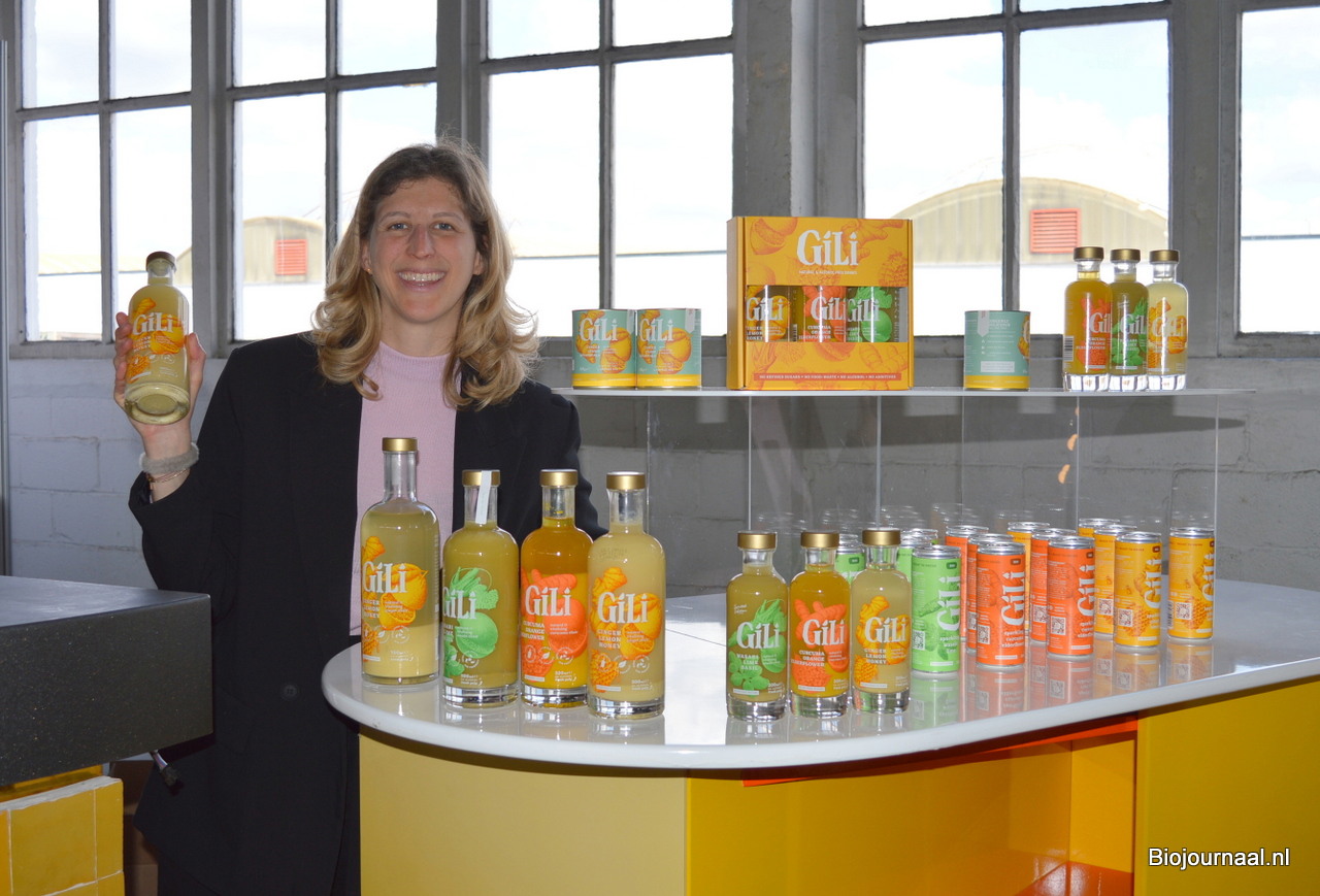Gaelle Mazza toont één van de natuurlijke en alcoholvrije biologische gemberdrankjes van Gili.