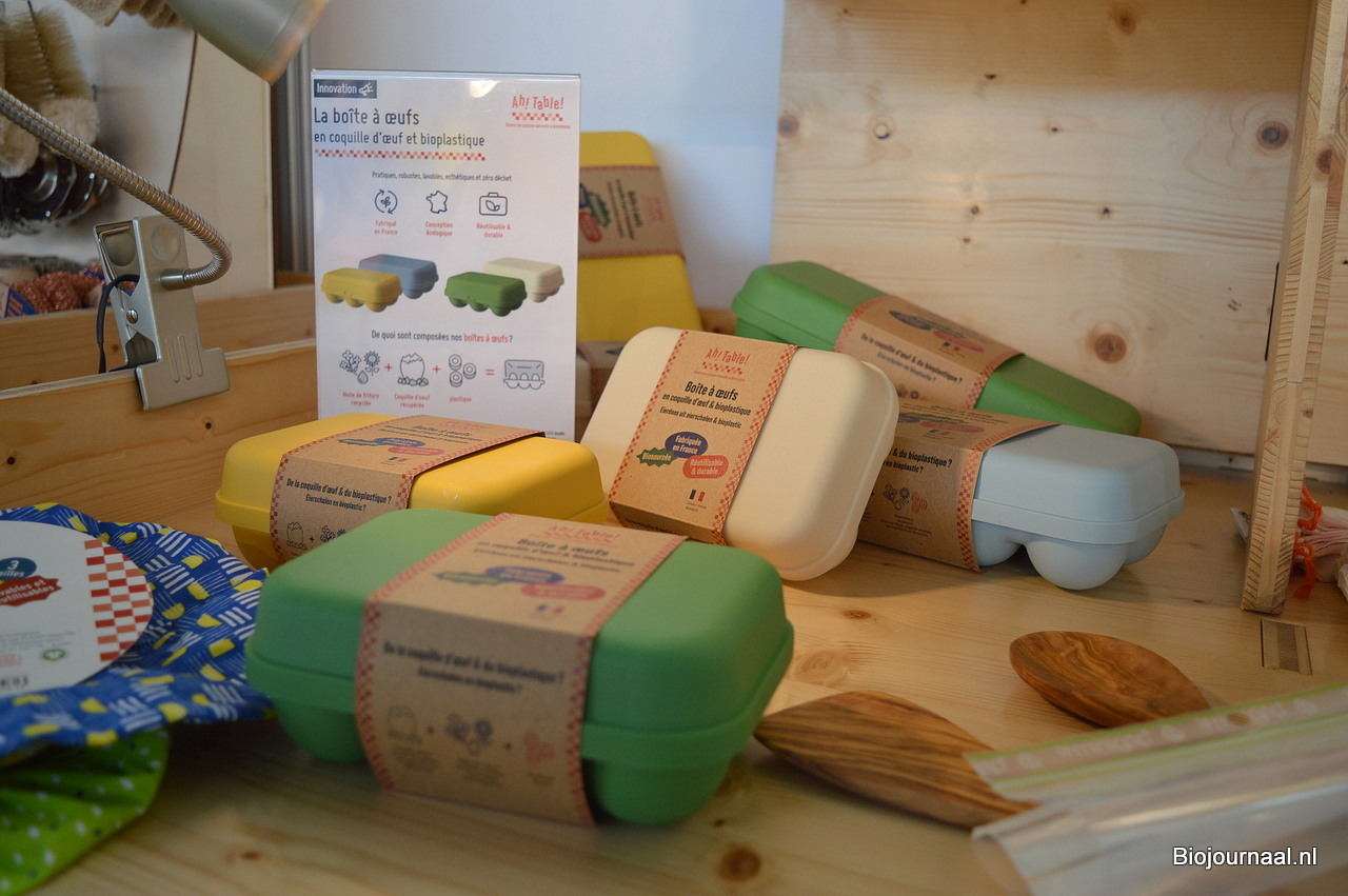 "Wij presenteren hier onder andere dit herbruikbare, wasbare en 100% recyclebare eierdoosje. Het is gemaakt van hergebruikte eierschalen en bioplastic."