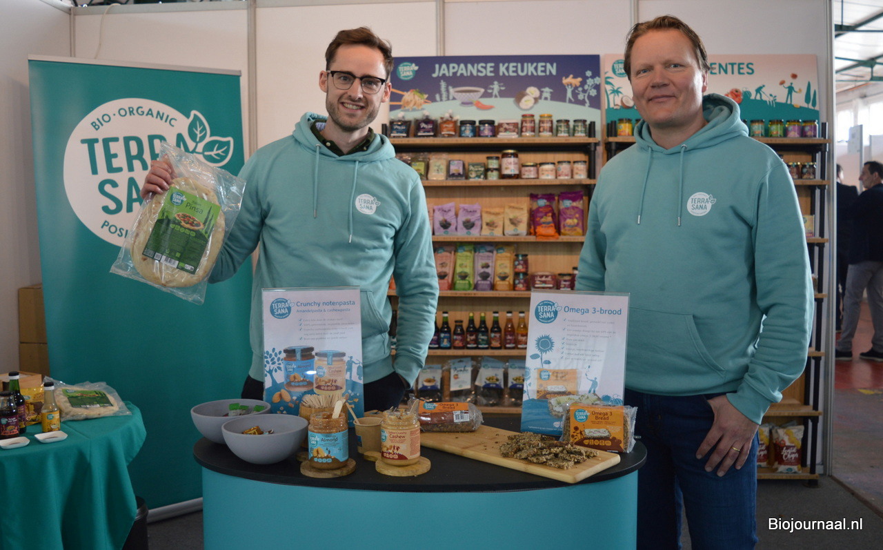 Remko Hartveldt en Boudewijn van der Kroft stonden namens TerraSana op de beurs. Men kon hier onder meer proeven van het nieuwe Omega-3 brood, de Umami saus en Teriyaki woksaus.
