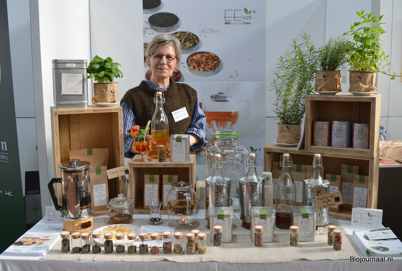 Binnen een jaar na de oprichting al voor het eerst op de BioXpo: Katelijne Van de Velde met Eeva. Met haar thee kan men onder meer zelf ijsthee maken.