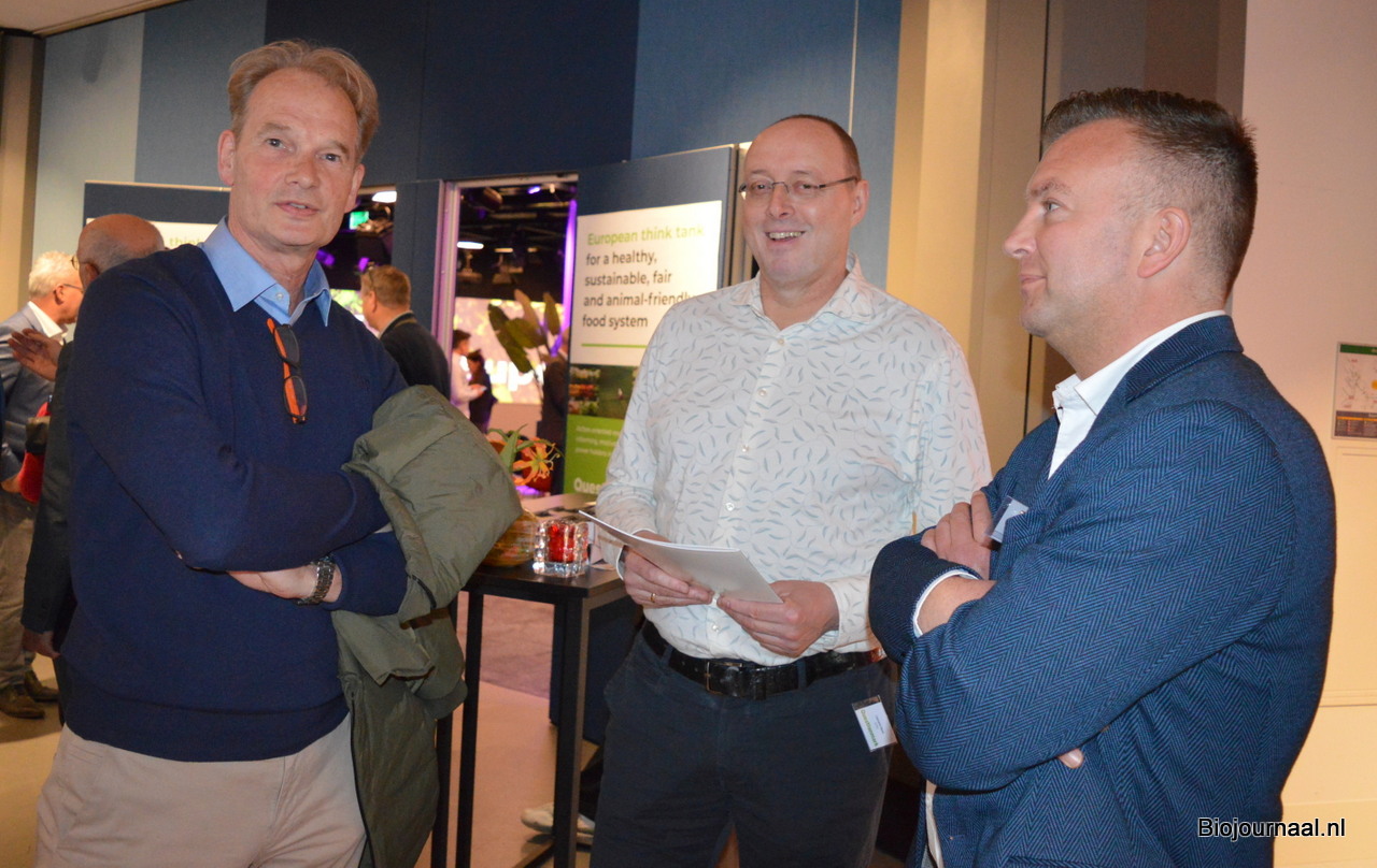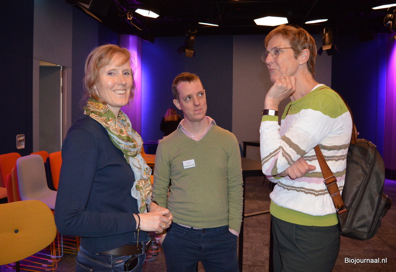 Deborah Winkel en Puck Simons van Questionmark begroeten Jan Groen (Green Organics, Bionext en BioNederland).