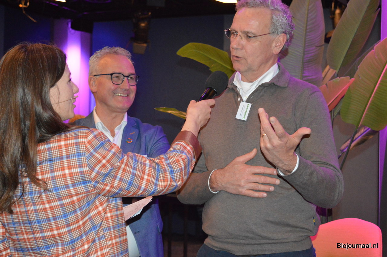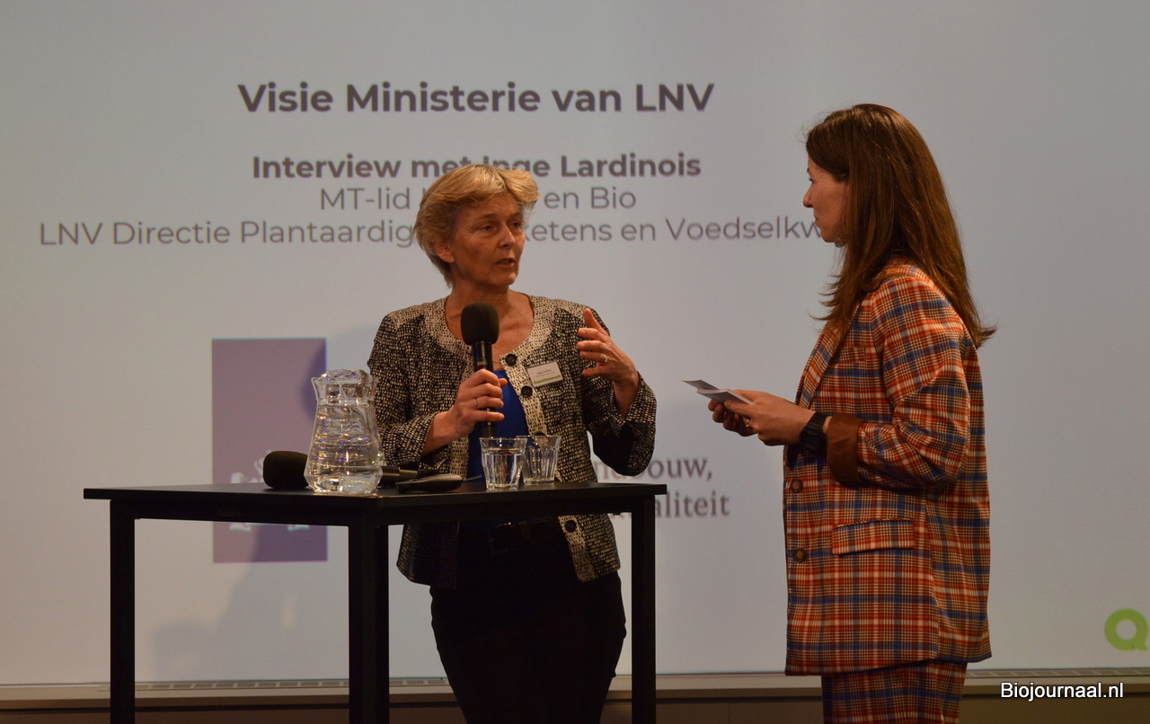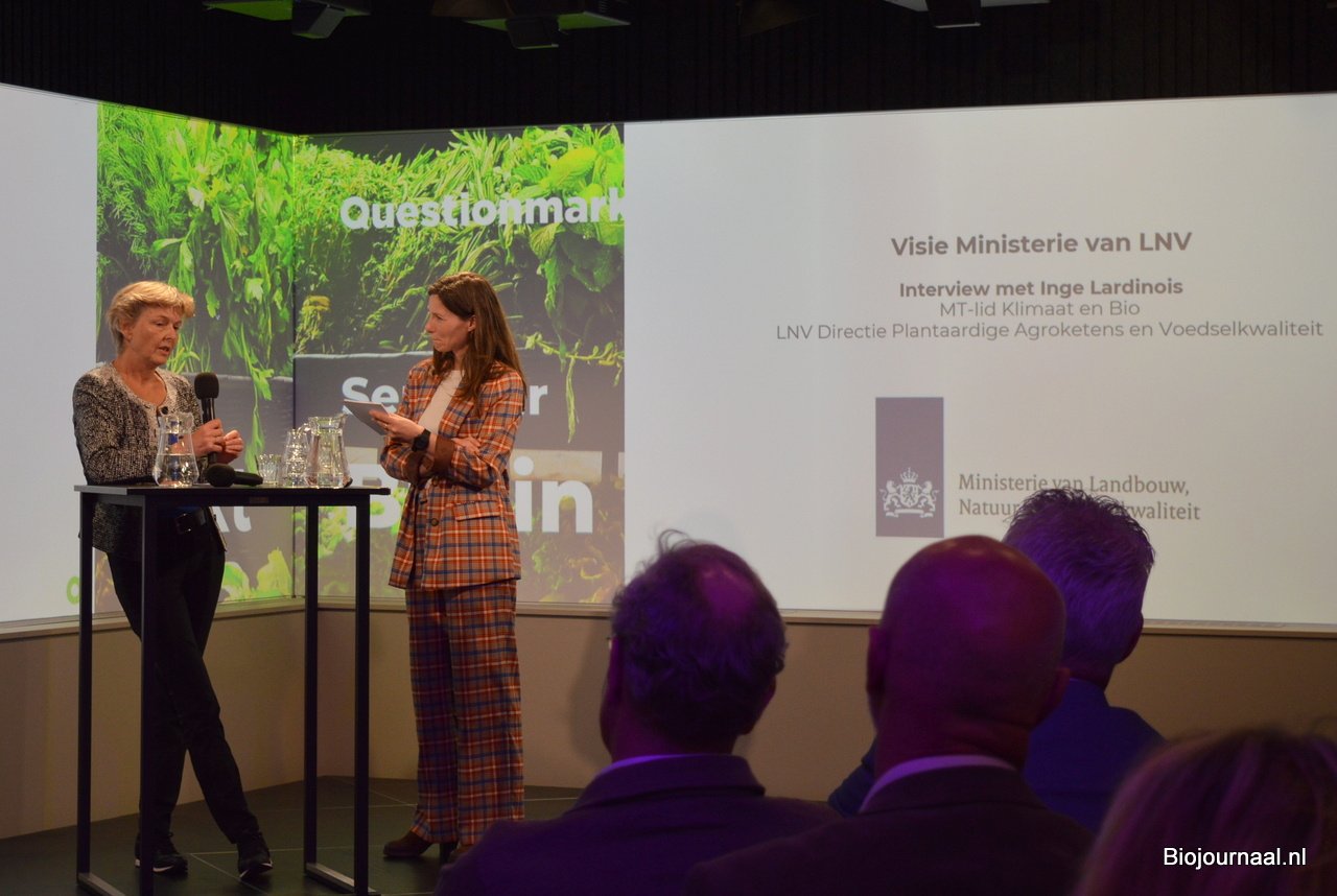 Na de presentatie van Gustaaf ging de dagvoorzitter in gesprek over de visie van het ministerie van LNV. Ze hield een interview met Inge Lardinois, MT-lid Klimaat en Bio. Inge vertelde onder meer over de consumentencampagne die er aan zit te komen.