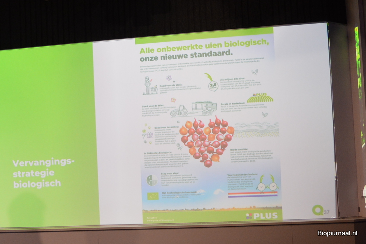 In zijn verhaal kwam uiteraard de 'vervangingsstrategie' uitgebreid aan bod. Na zuivel werd ook voor alle onbewerkte aardappelen biologisch de nieuwe standaard. En binnenkort komen daar ook alle onbewerkte uien bij.