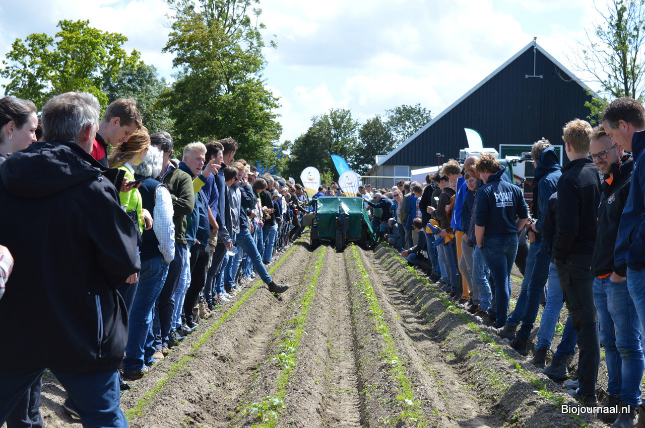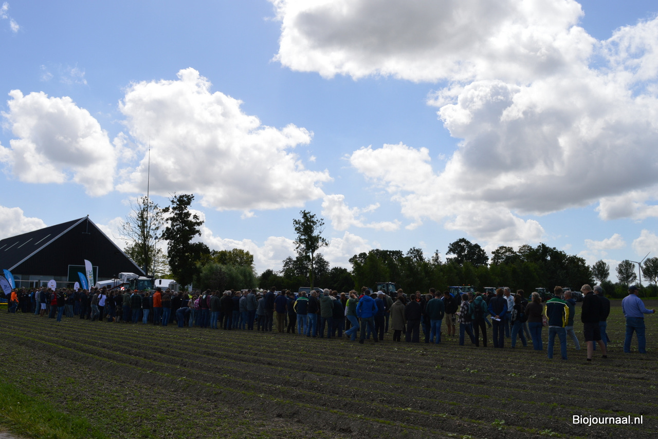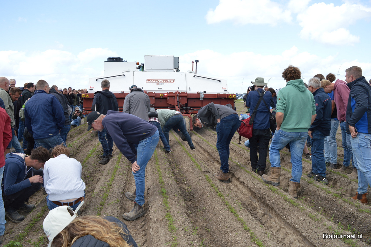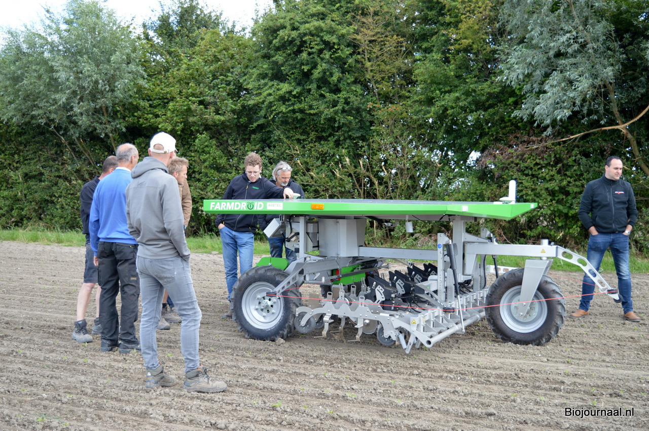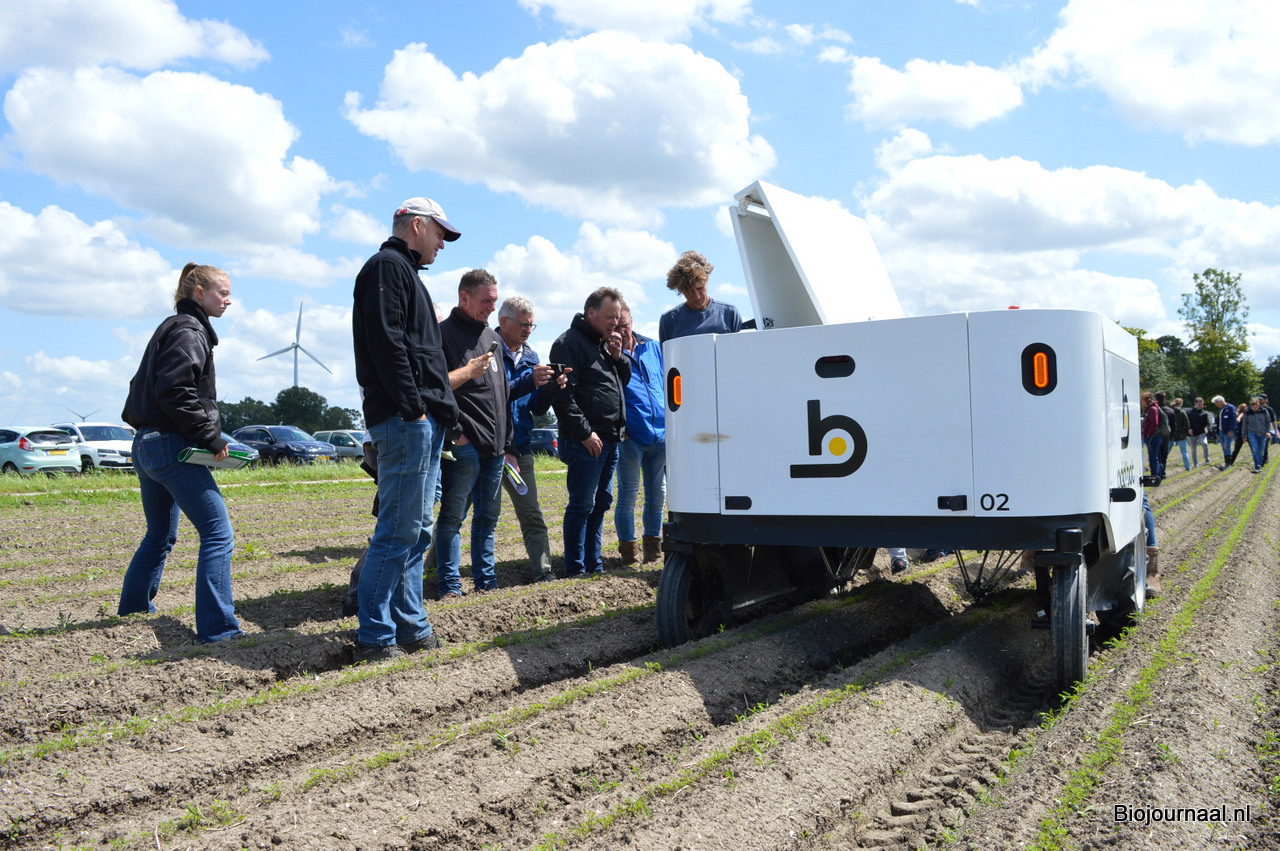 Een grote groep mensen liet zich informeren over de mogelijkheden met de robots voor onkruidbestrijding in biologische gewassen.