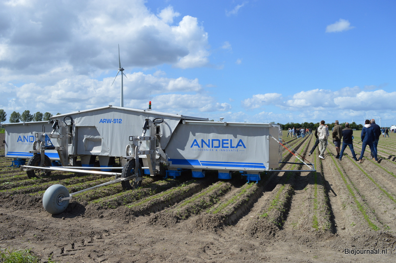 De nieuwste ontwikkeling is een combinatie van robotwieden met elektrisch schoffelen. Andela kwam op de BioVelddag met een dergelijke combinatie voor onkruidbestrijding tussen en in de rij.