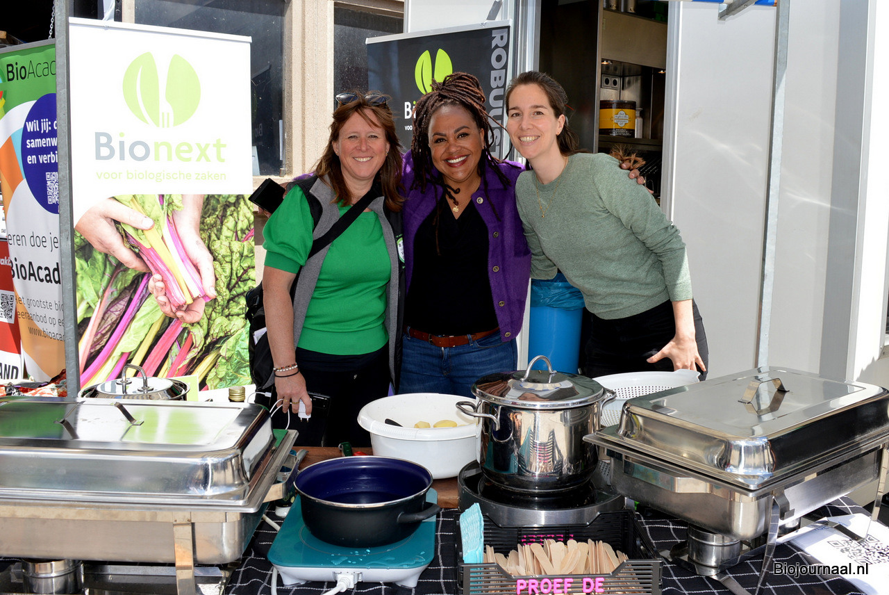 Geertje Schlaman (BioAcademy en organisatie BioVelddag), Sharon de Miranda (TV-kok) en Leonie van der Velden (Bionext).