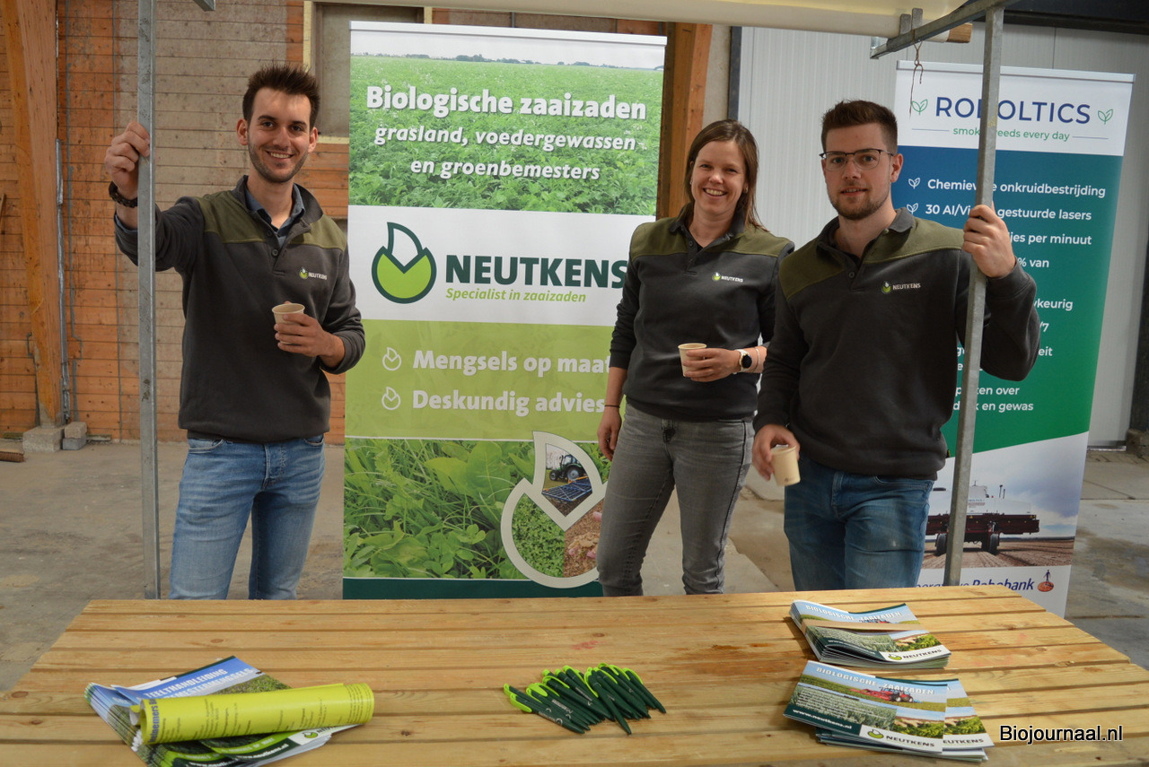 Marco d'Haens, Geertje Claassen en Kevin Mannens bij Zaadhandel Neutkens. Marco: "We bieden heel veel mengsels op maat. Vanwege de weersomstandigheden zijn heel veel percelen niet gezaaid, dan is bodemverbetering met een stikstofbindend gewas een goede optie."