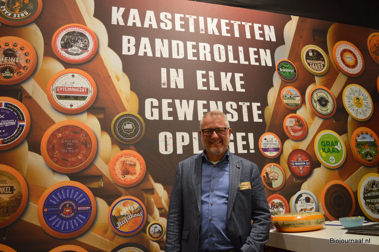 Michiel van Wondergem bij Euroflex tussen een biodynamisch en biologisch kaasetiket (voor Aurora kaas en Hooidammer).