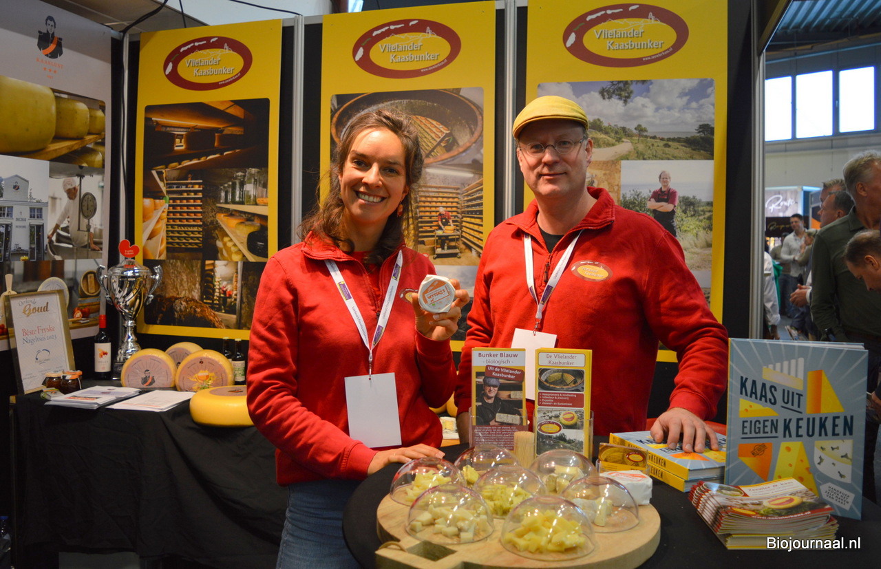 Vlielander Kaasbunder presenteerde de nieuwe biologische witschimmelkaas. Op de foto Margriet de Vries en Nils Koster.