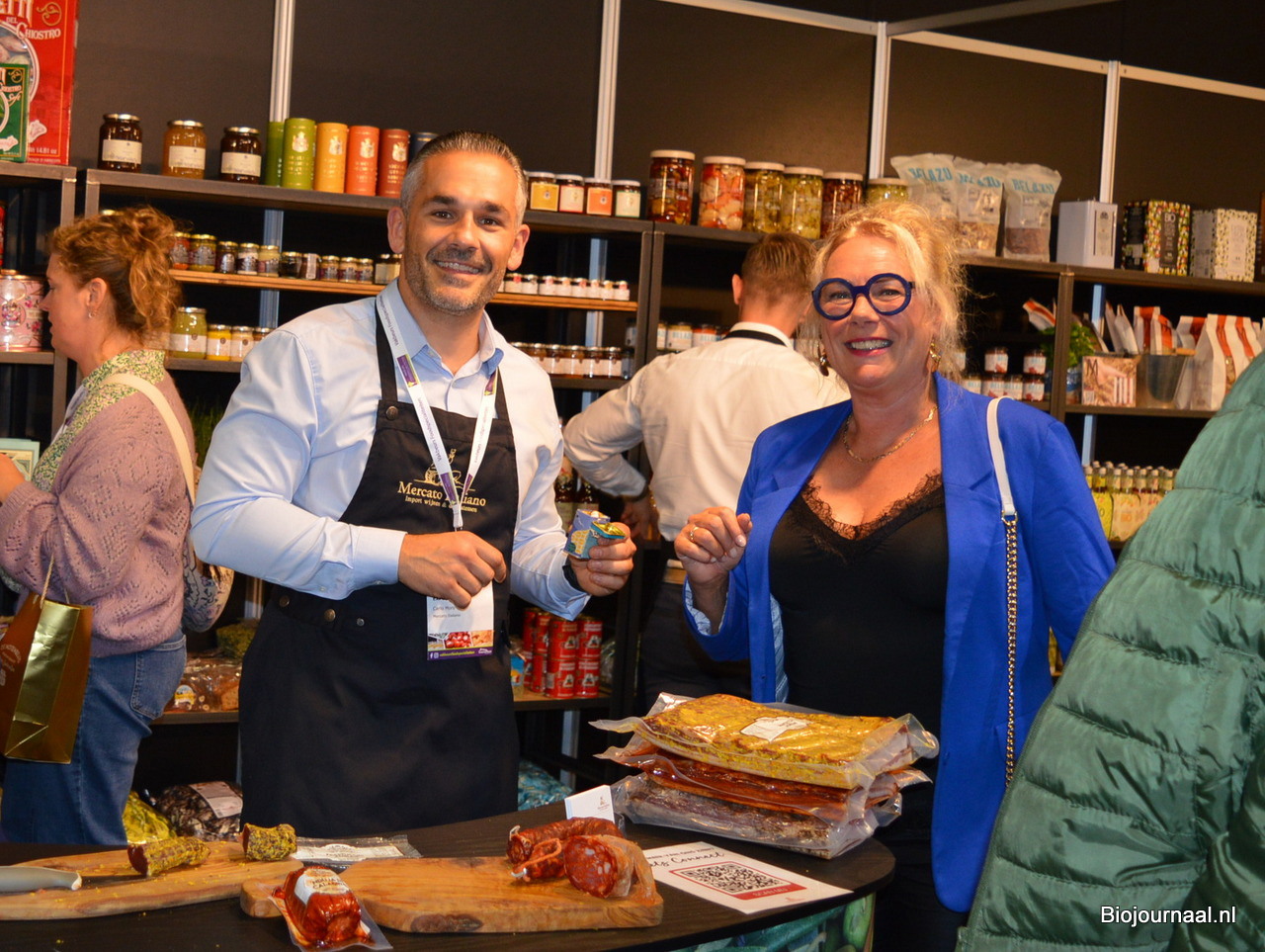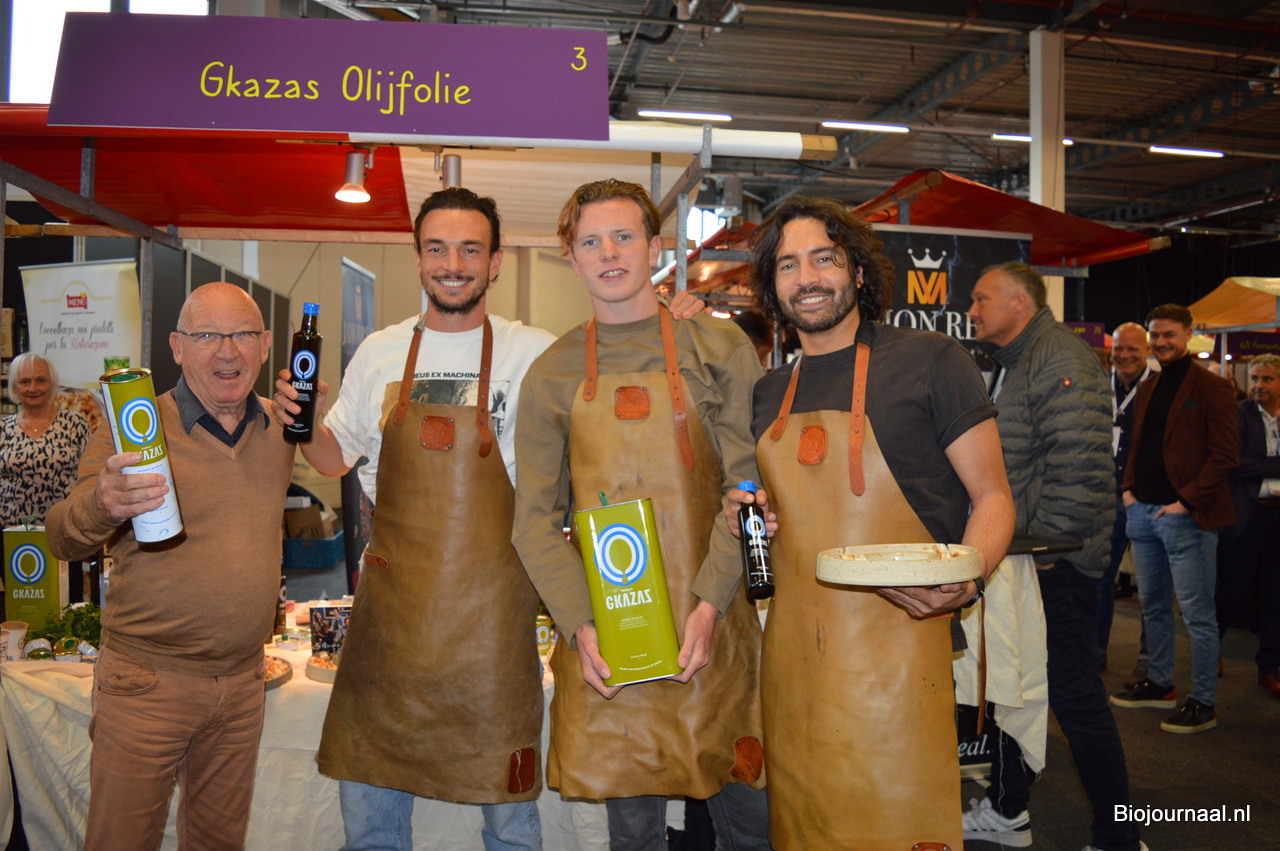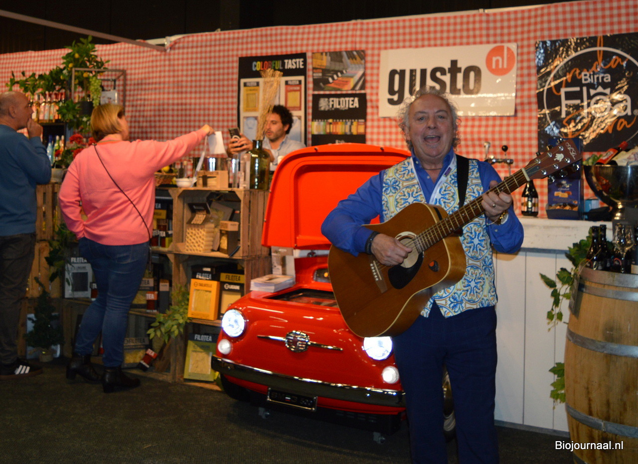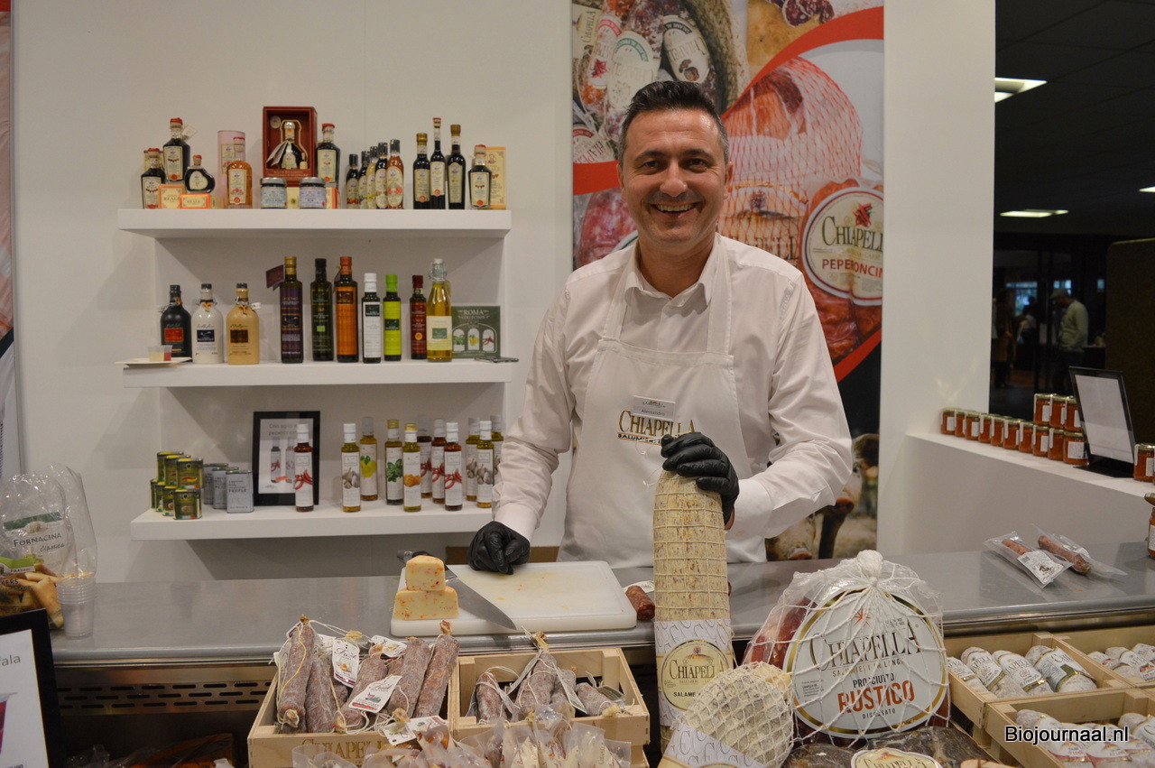Allesandro bij Naturalia. Dit keer weinig ‘bio-blaadjes’ in de stand. Achter hem zie je een biologische olijfolie staan.