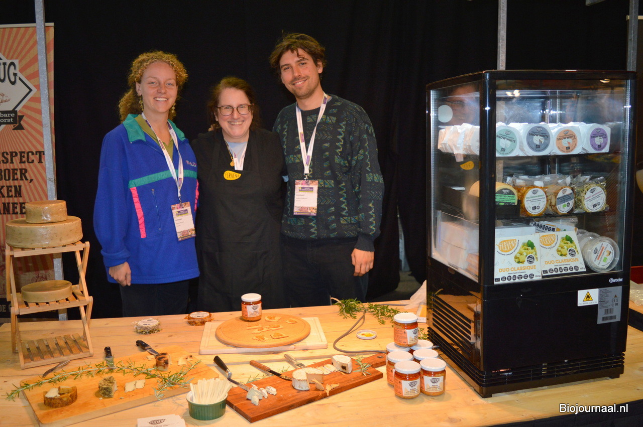 Voor het eerst op deze beurs: Fervena. Sascha Kersten, Venetka Agayn en Willem Kalkman lieten proeven van de plantaardige kazen. Venetka: “Steeds meer cateraars en winkeliers vinden vegan interessant.”
