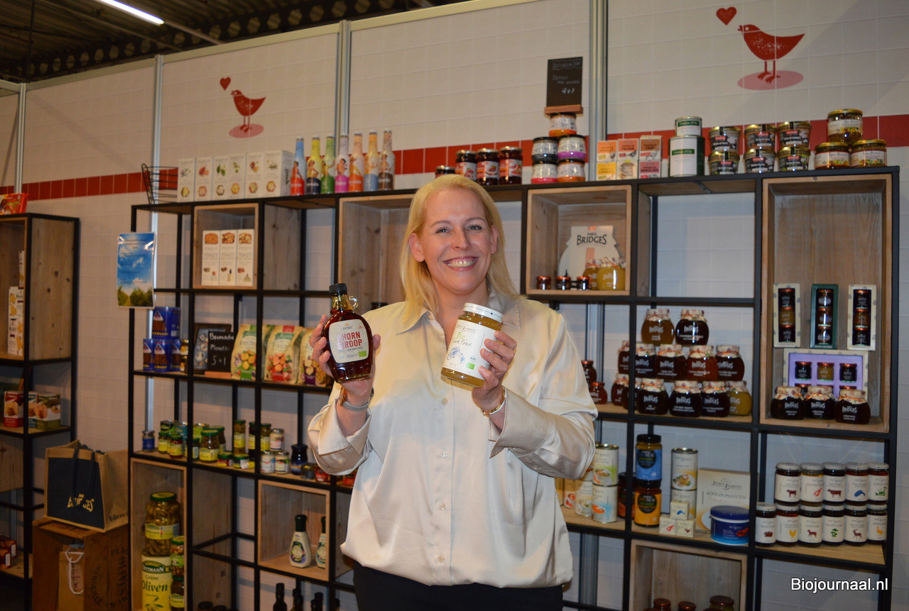 Geraldine van den Heuvel met de enige bio-producten van Brauer Food (Ahornsiroop en Fond).