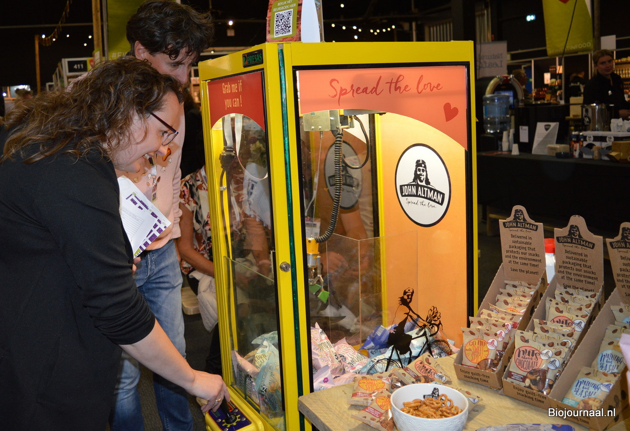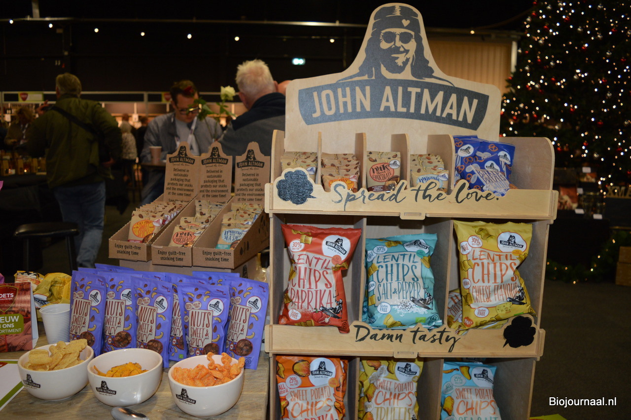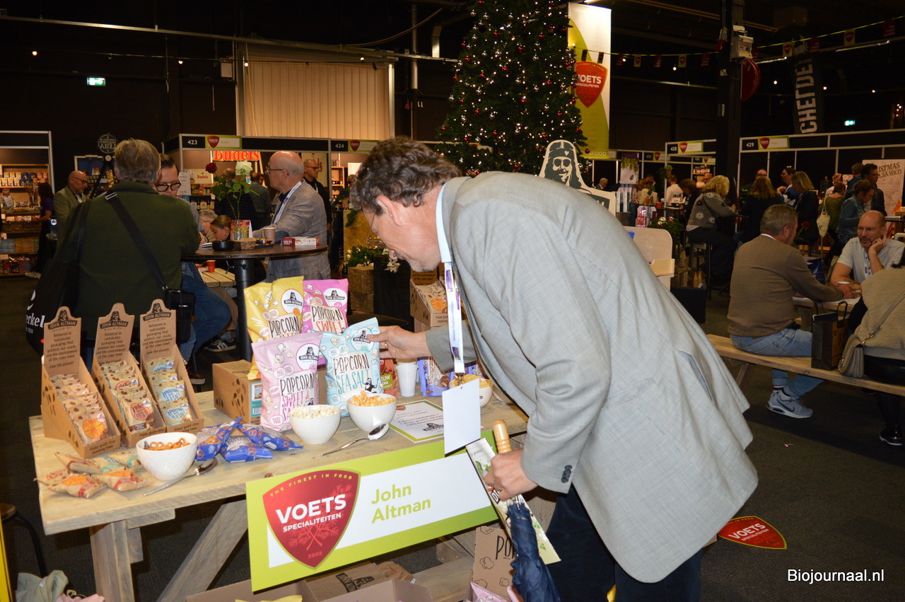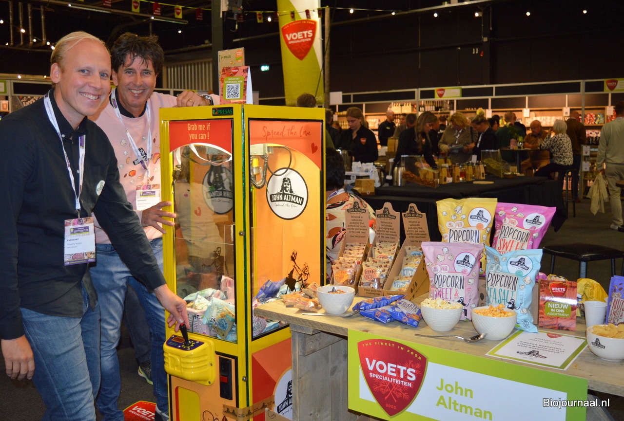 Timothy Nuijen en Arnoud Francken presenteerden diverse nieuwe producten van John Altman: onder meer biologische popcorn Sweet Chilli en Salted Caramel.