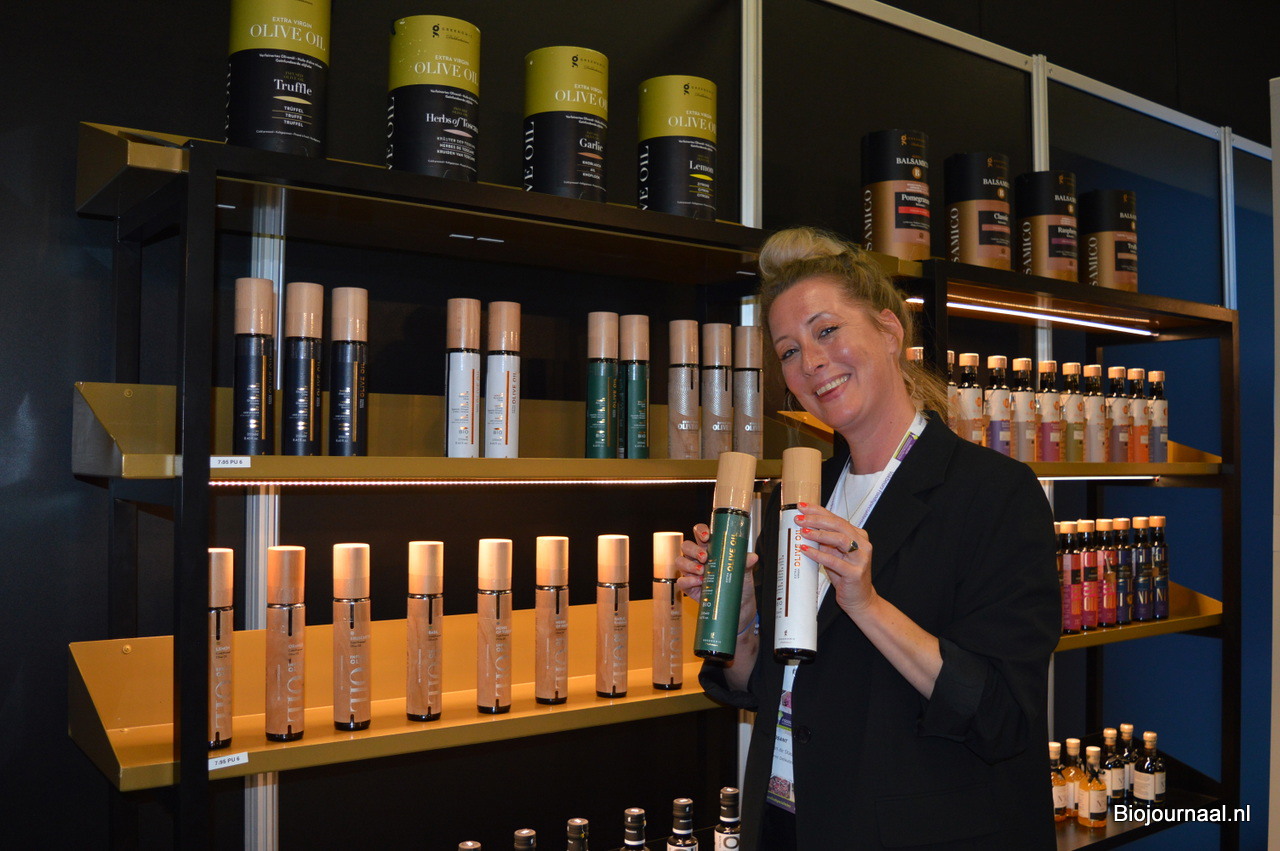 Elle van de Stadt toont de biologische olijfolie die bij Greenomic Delikatessen verkrijgbaar is.
