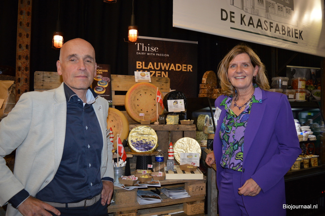 Arto Karacoban vertelde de bezoekers meer over de biologische kazen van het Deense merk Thise. Rechts Mariëlle David.