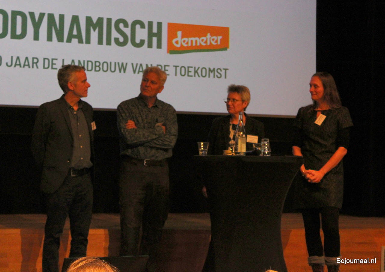 Links naar rechts: Dr Jurgen Fritz, bodemkundige Tom Saat, Dr Marianne Siegmund-Schultze teamleider WUR, Dr Ilse Geijzendorffer directeur Louis Bolk Instituut 'De paneldiscussie met de 'zaal' was verhelderend.'