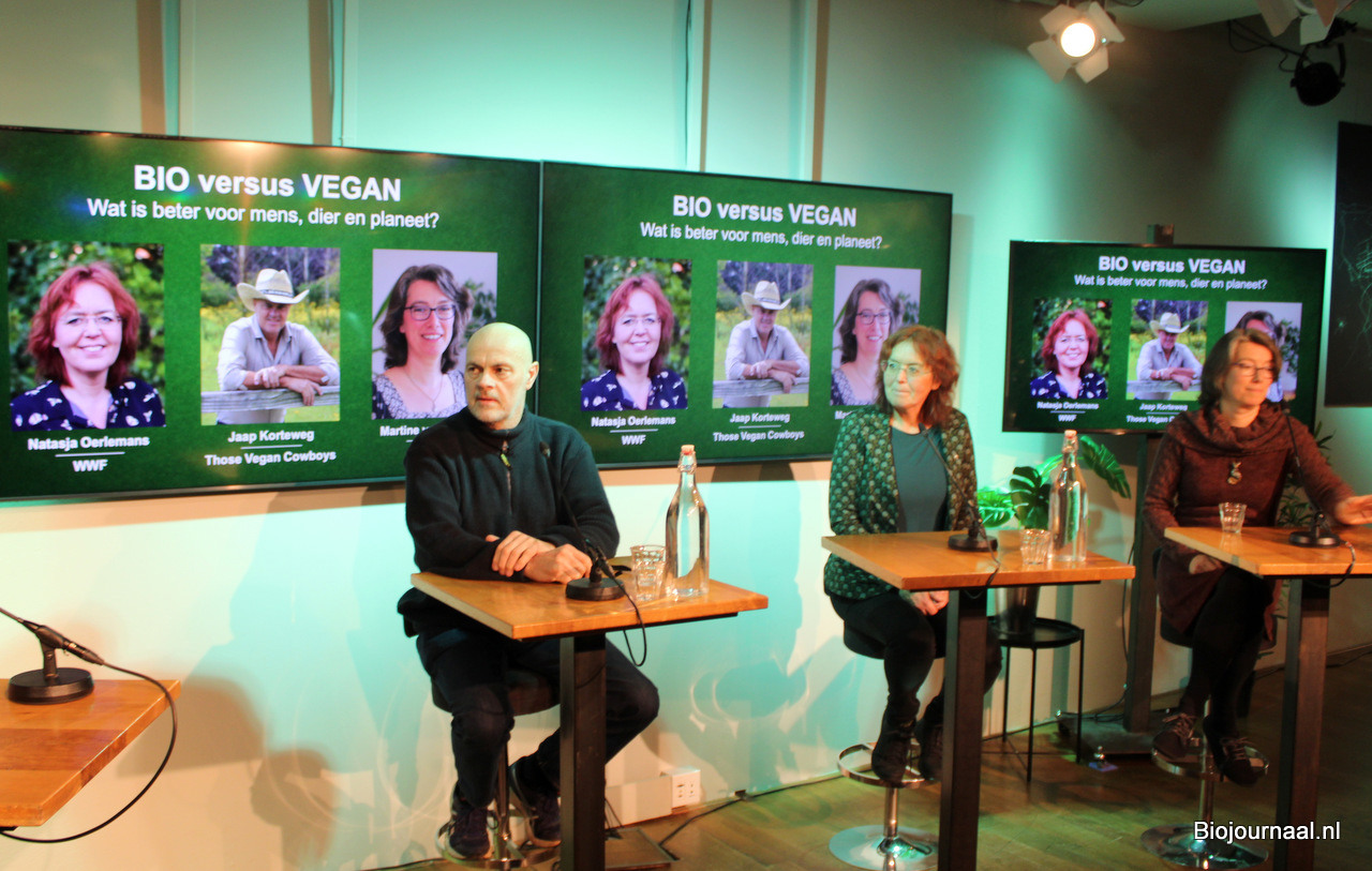Jaap Korteweg, Natasja Oerlemans en Martine van Haperen van Proveg gaan in discussie met de 'zaal'.