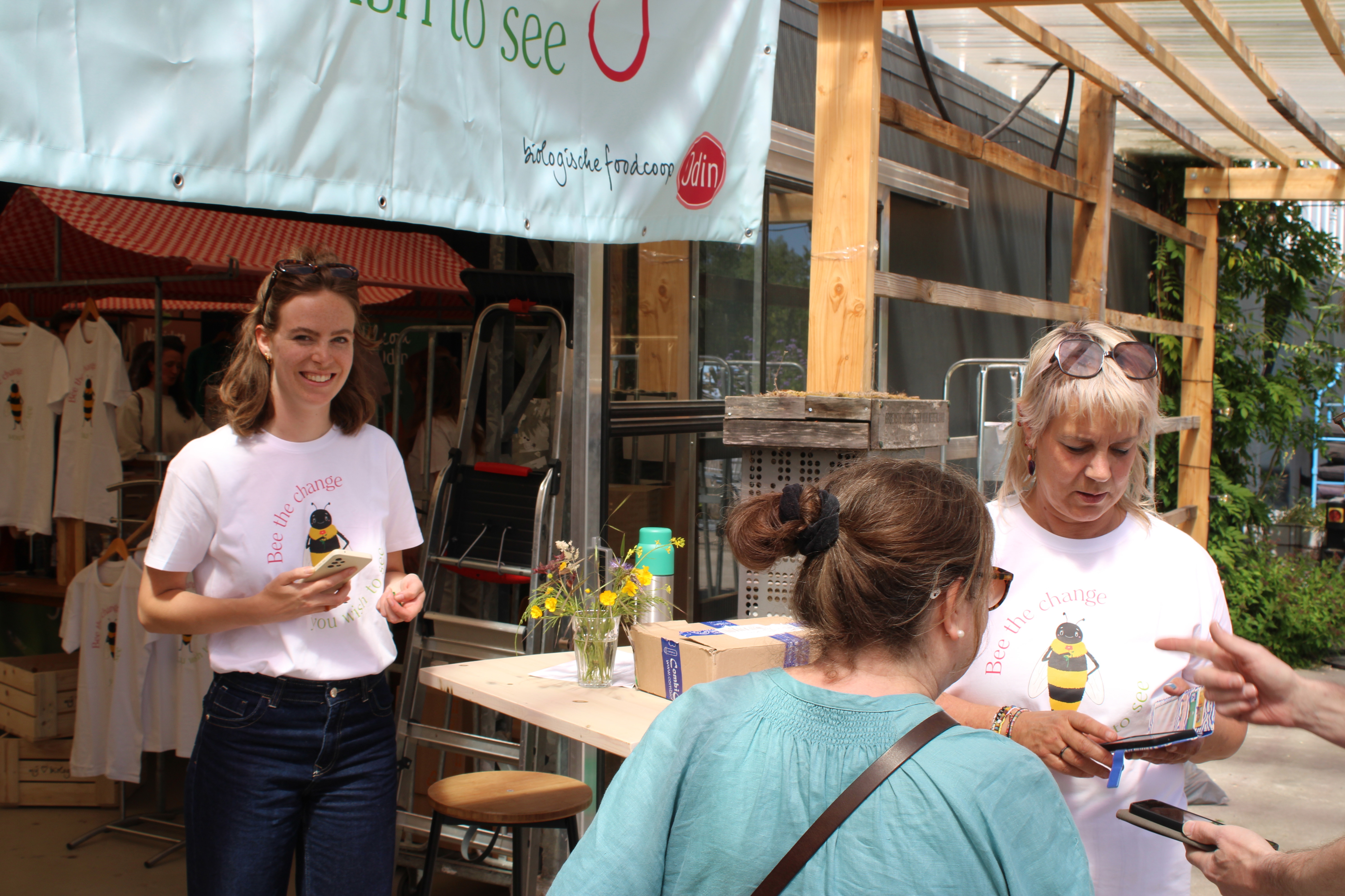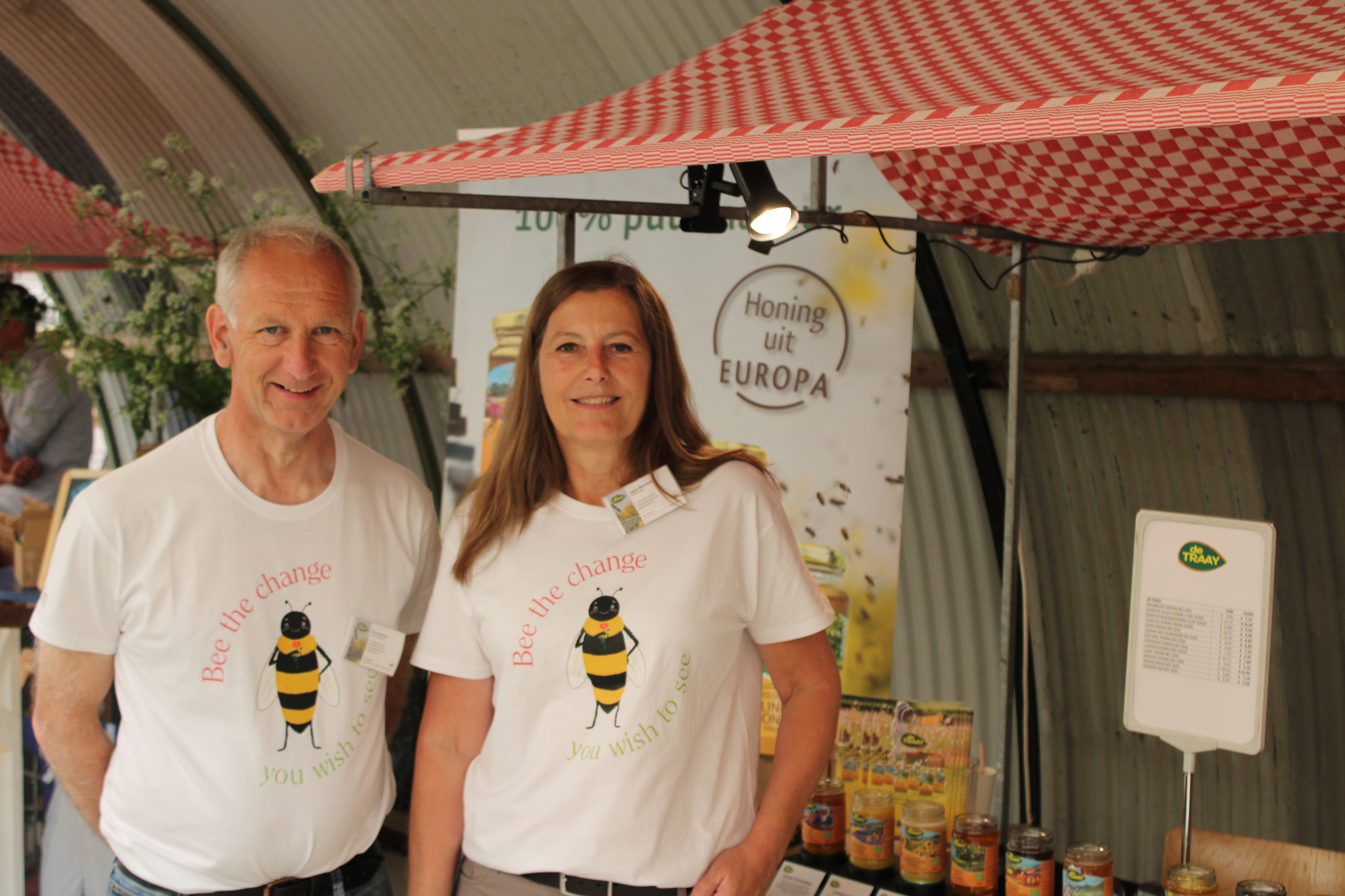 Rechts Joyce Weerman en haar collega Eric van Gool van Imkerij de Traay: "Vandaag een dag om lekker van onze honing te proeven"