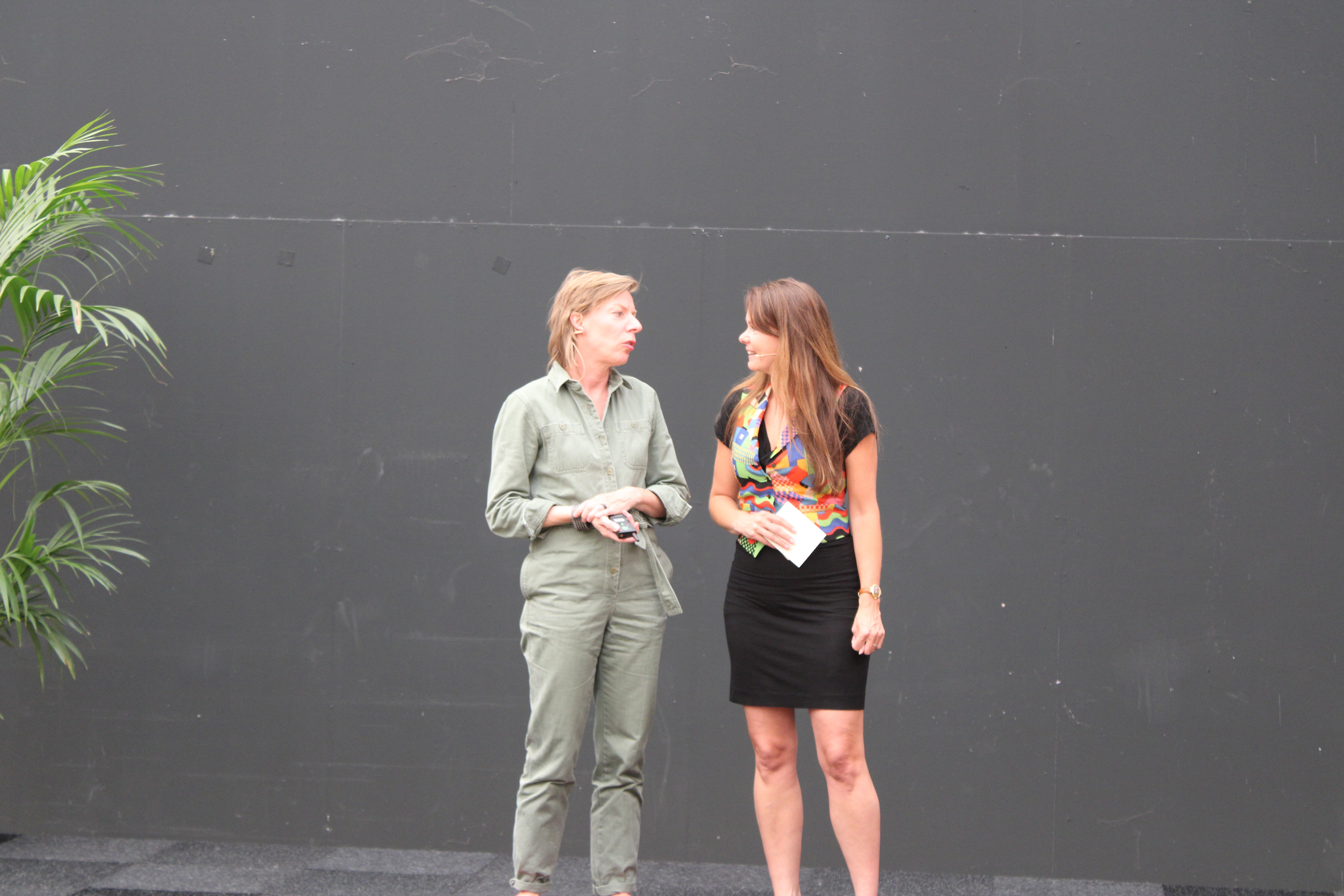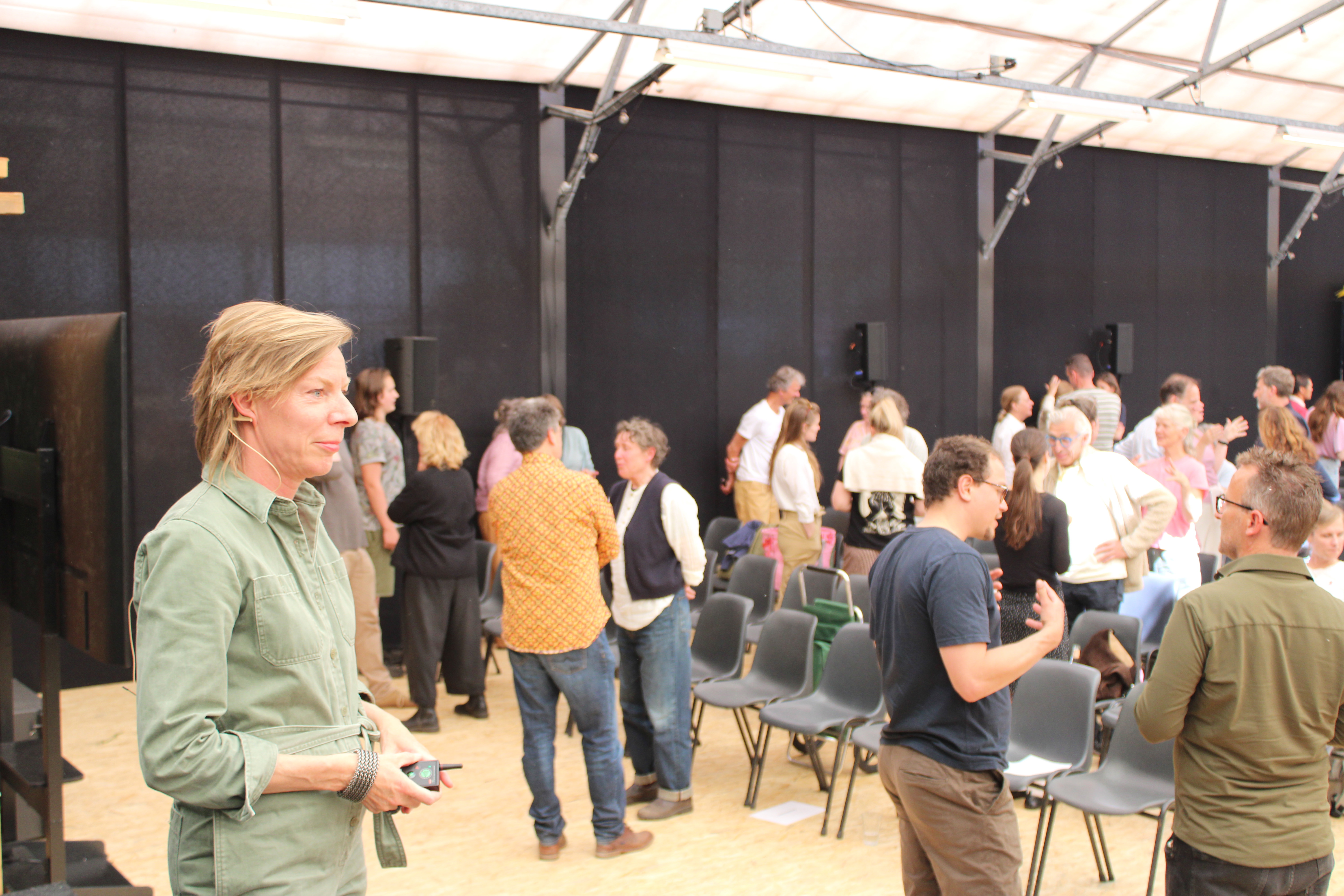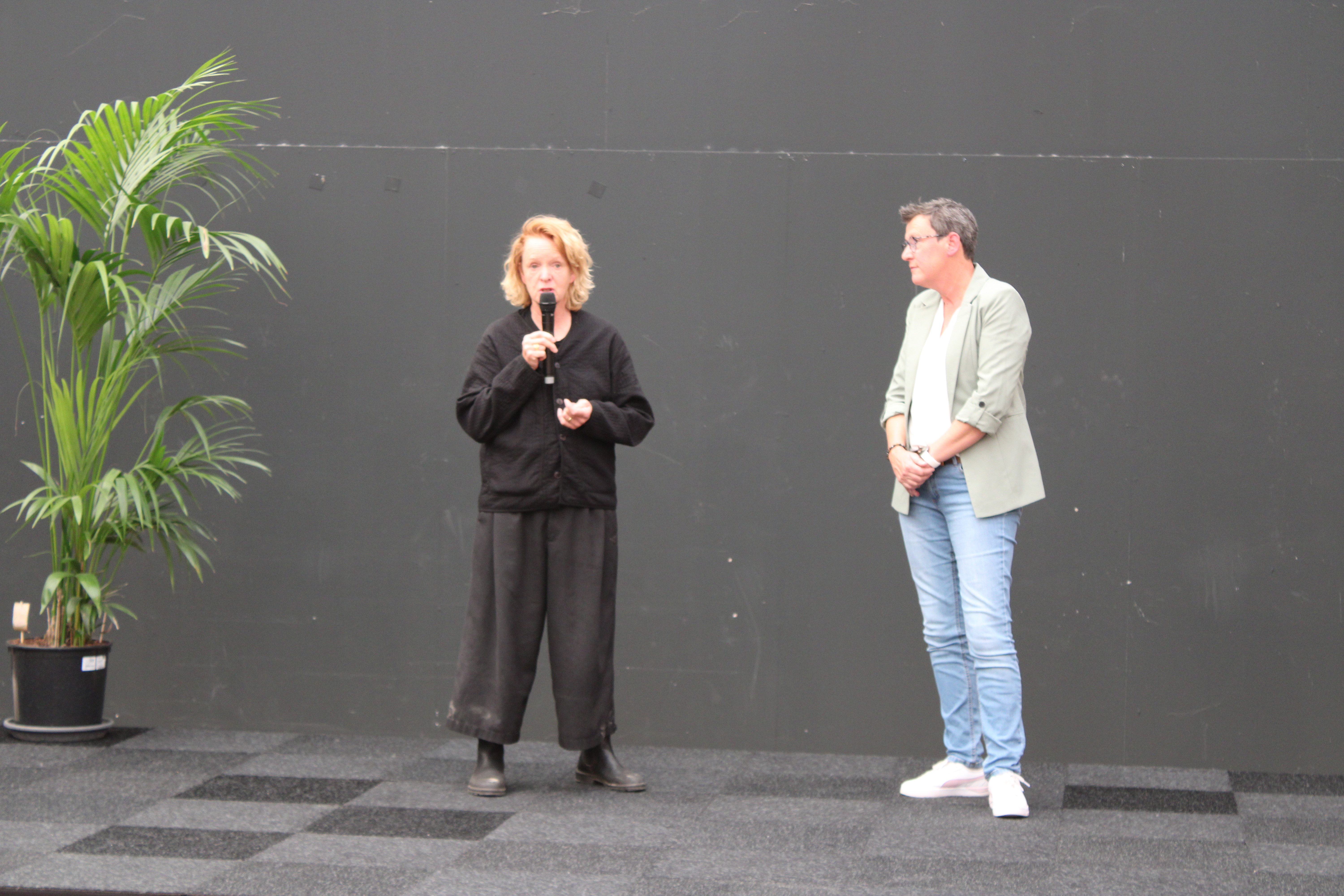 Merle Koomans algemeen directeur van Odin luistert aandachtig naar het succesverhaal van Claudia Jongstra, kunstenaar en activist