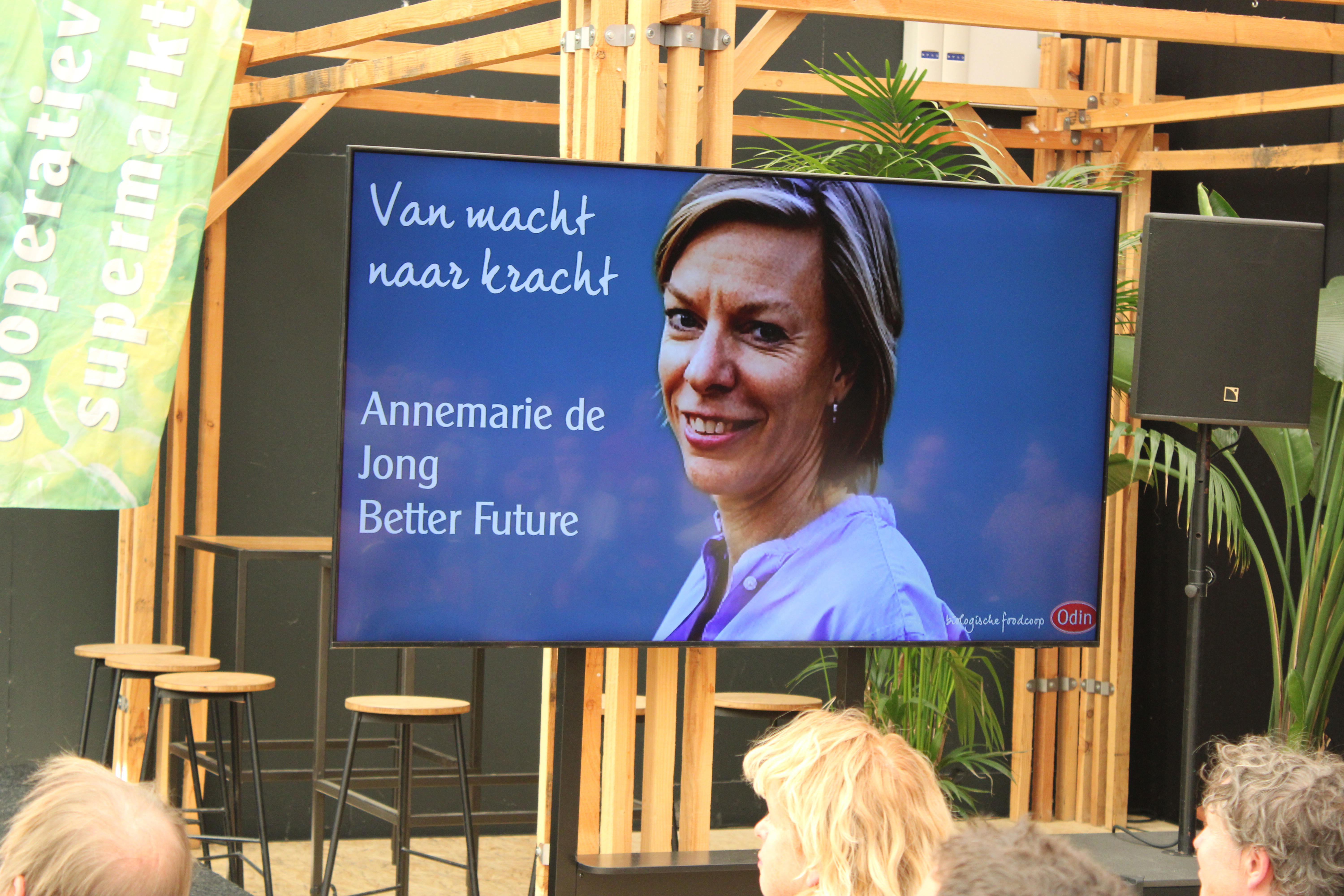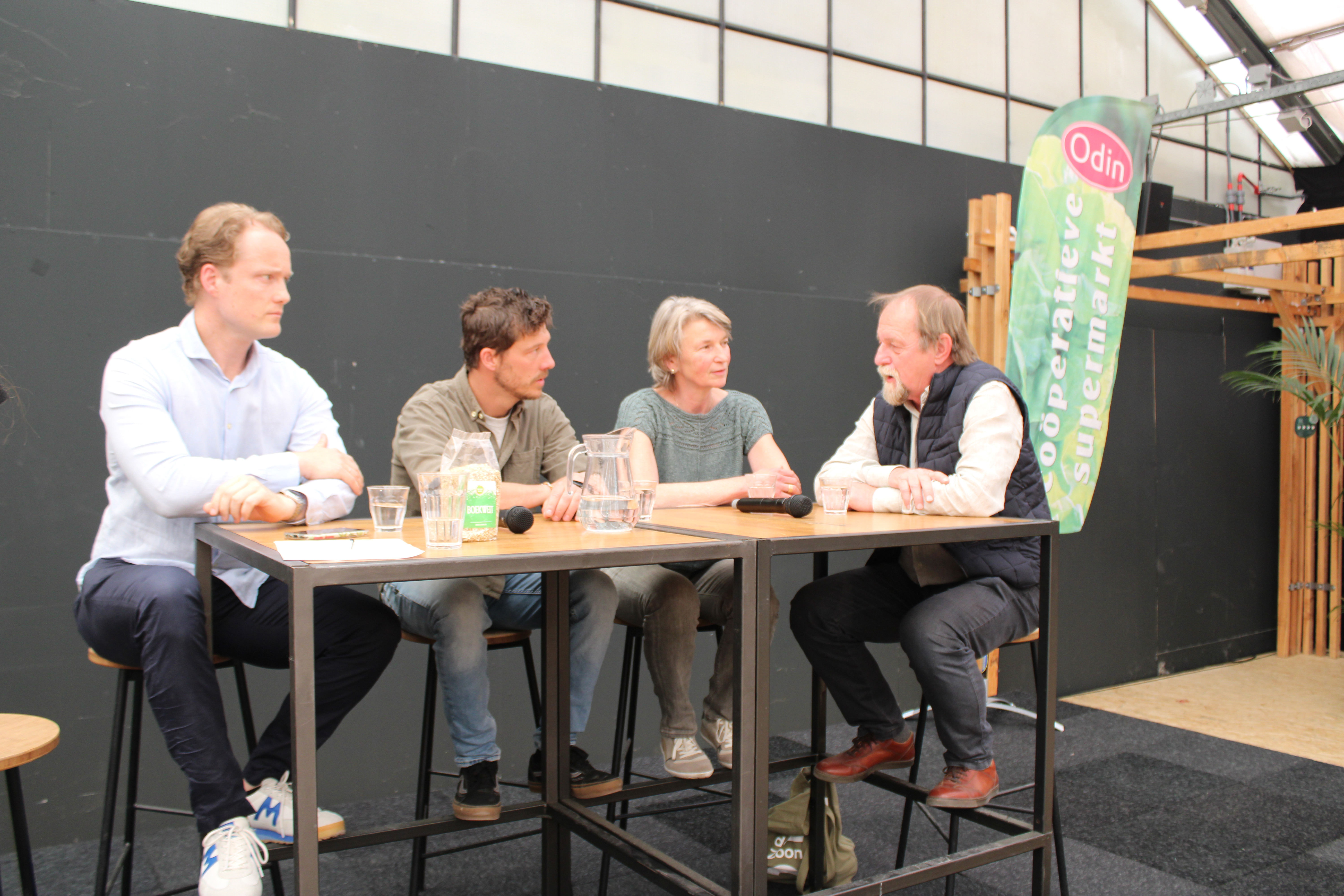Van links naar rechts: Wouter Wezenbeek, hoofd inkoop van Odin, Rogier Scherpbier van Zonnespelt, Dagmar van Rijnbeek namens de ledenraad van Odin en Poppe Braam van Braamstruik en Did-It. Aan het begin van een interessante talkshow.