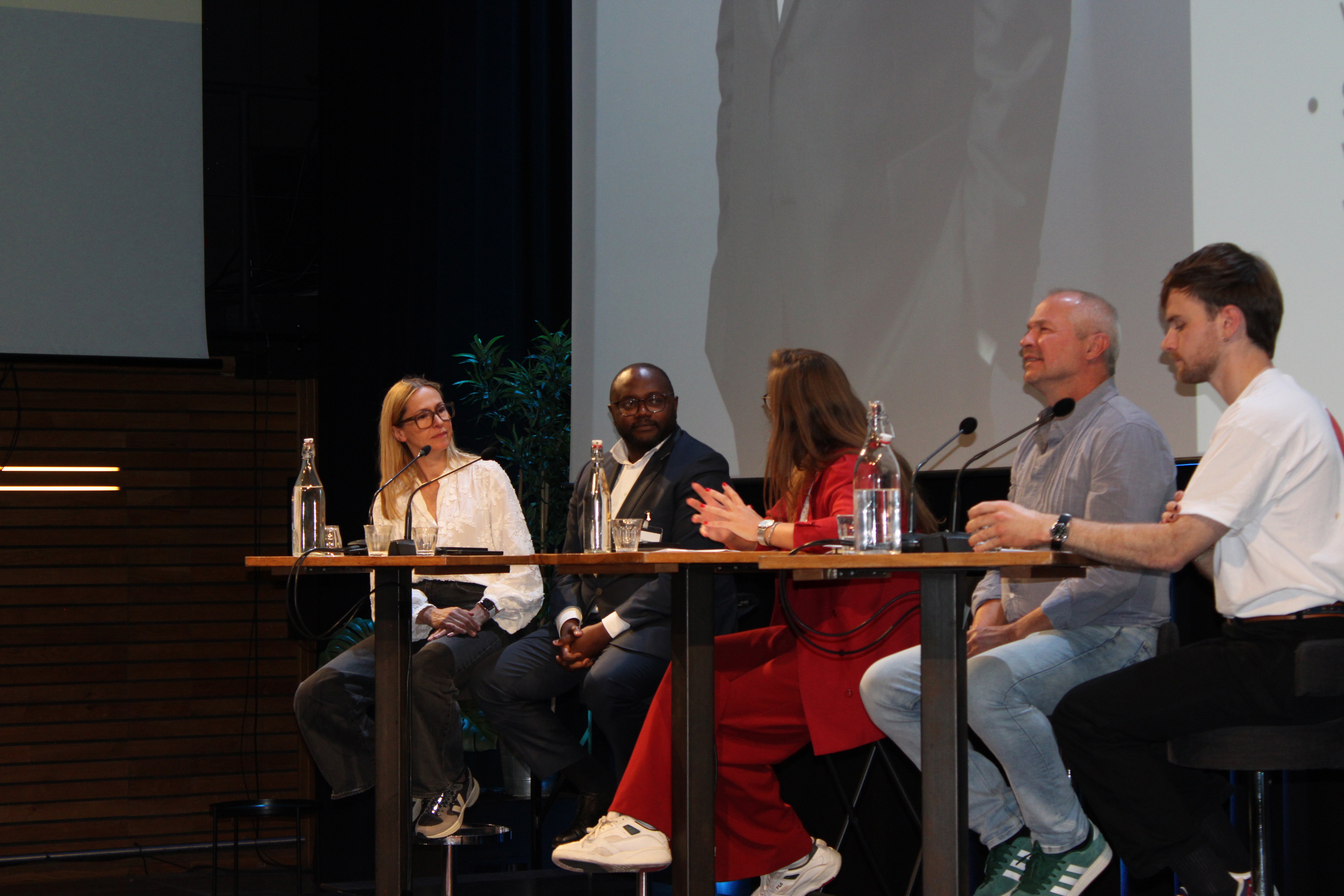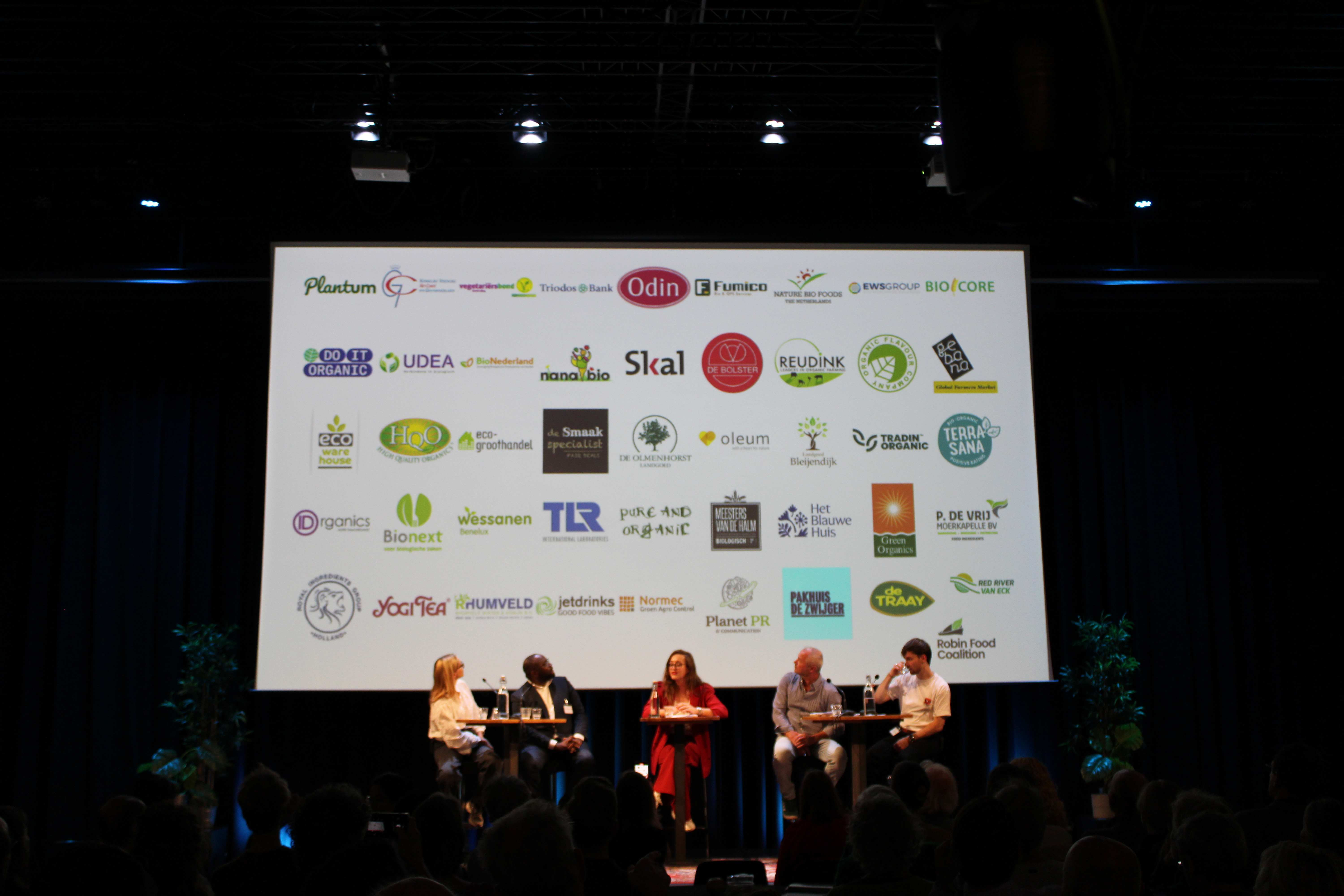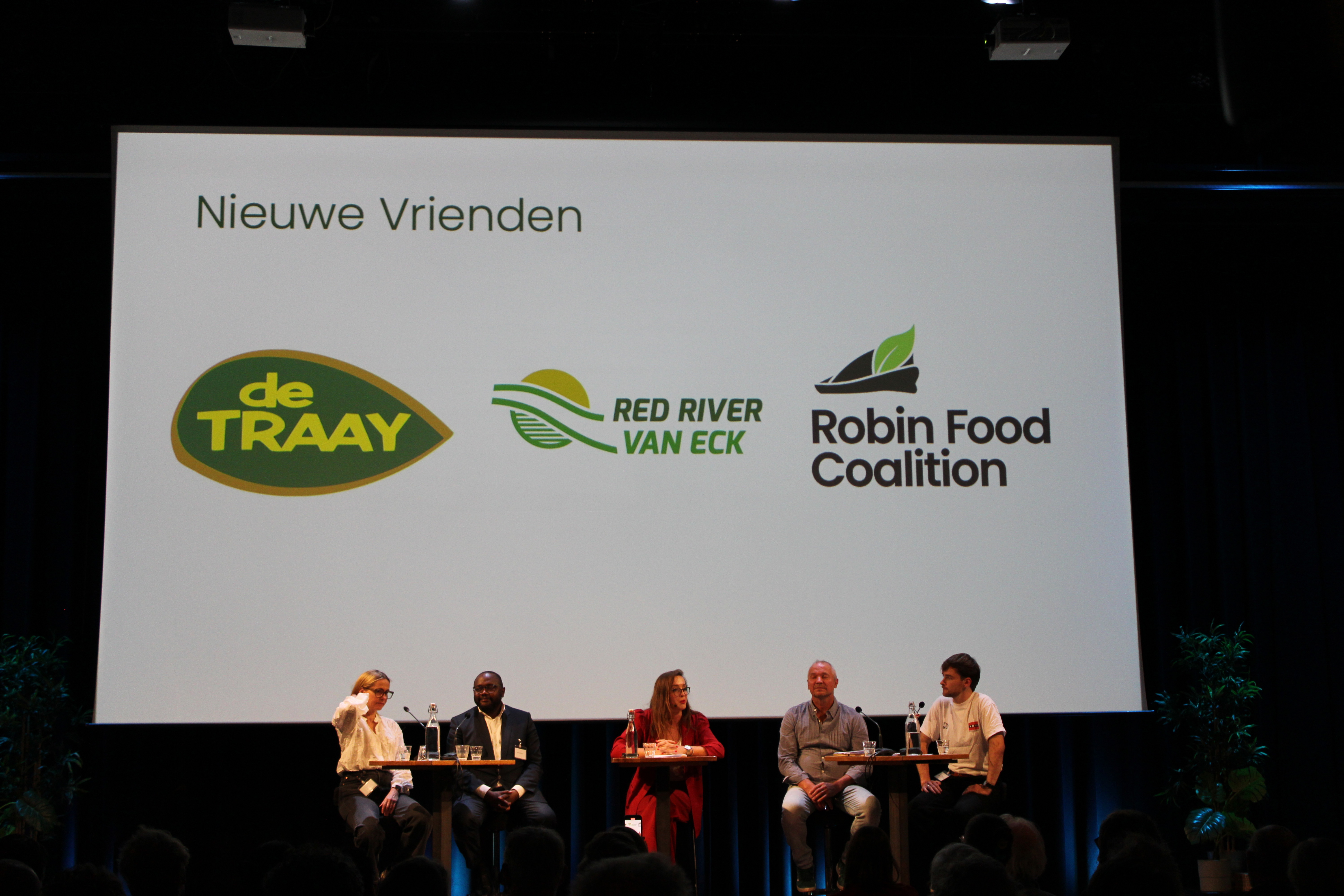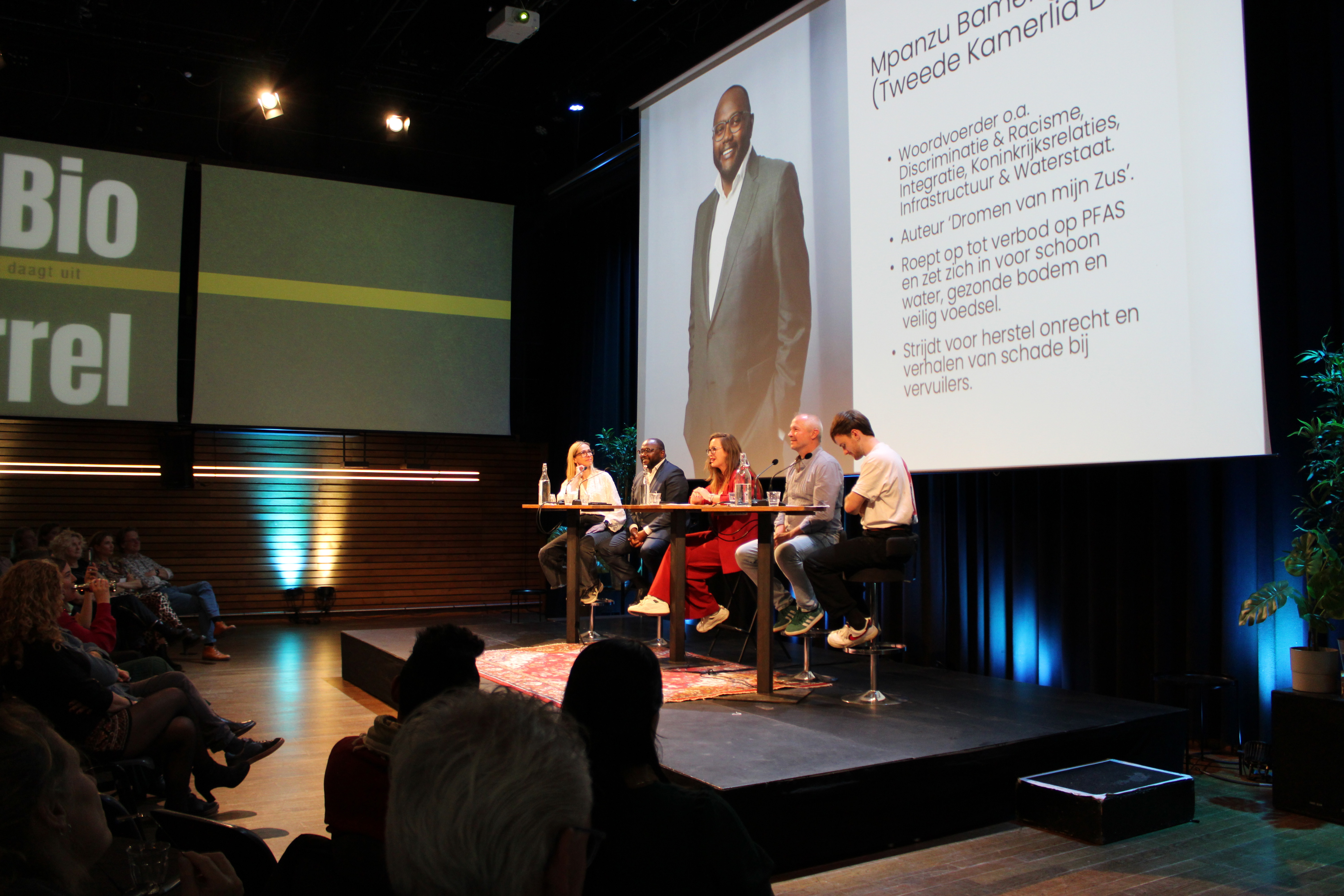 Het panelgesprek werd gevoerd door van links naar rechts: Annelies den Boer, directeur van Stichting Tegengif, Tweede Kamerlid Mpanzu Bamenga, Moderator Josefien van Marlen, agro-ecologische boer Arjen van Buuren en onderzoeksjournalist Leon Zantinge en