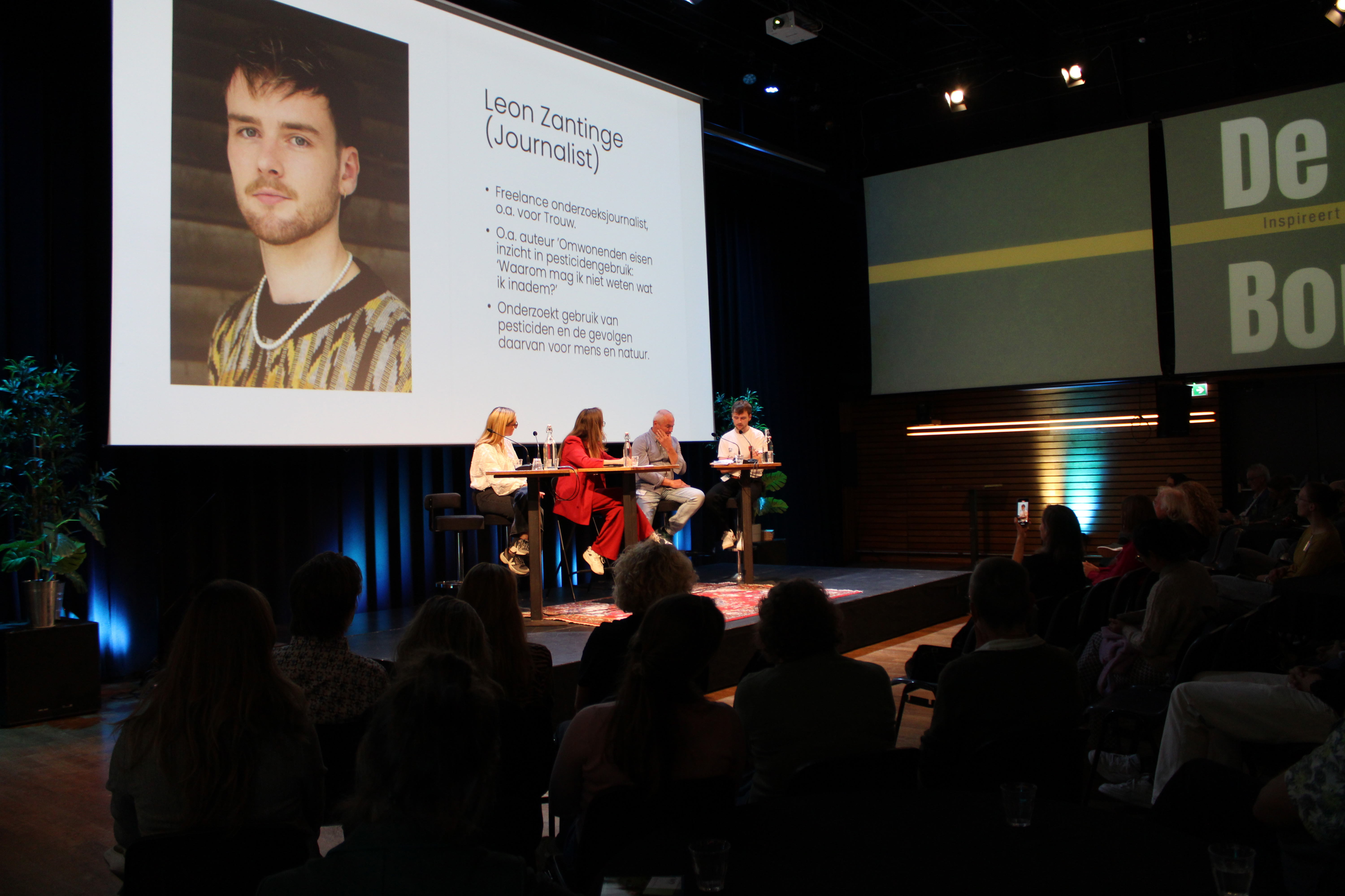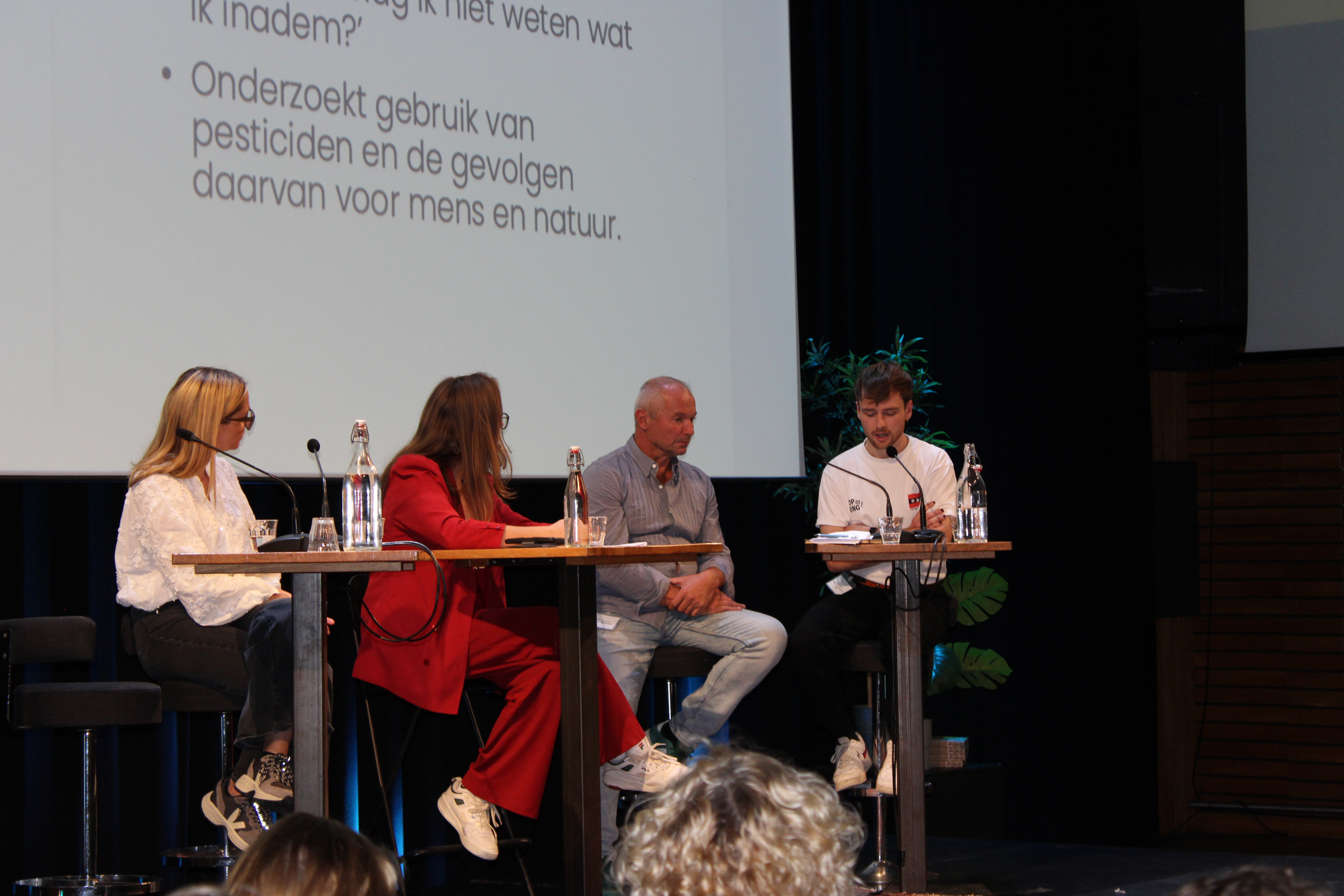 Moderator Josefien van Marlen, Agro-ecologische boer Arjen van Buuren, Annelies den Boer, directeur van Stichting Tegengif en onderzoeksjournalist Leon Zantinge.