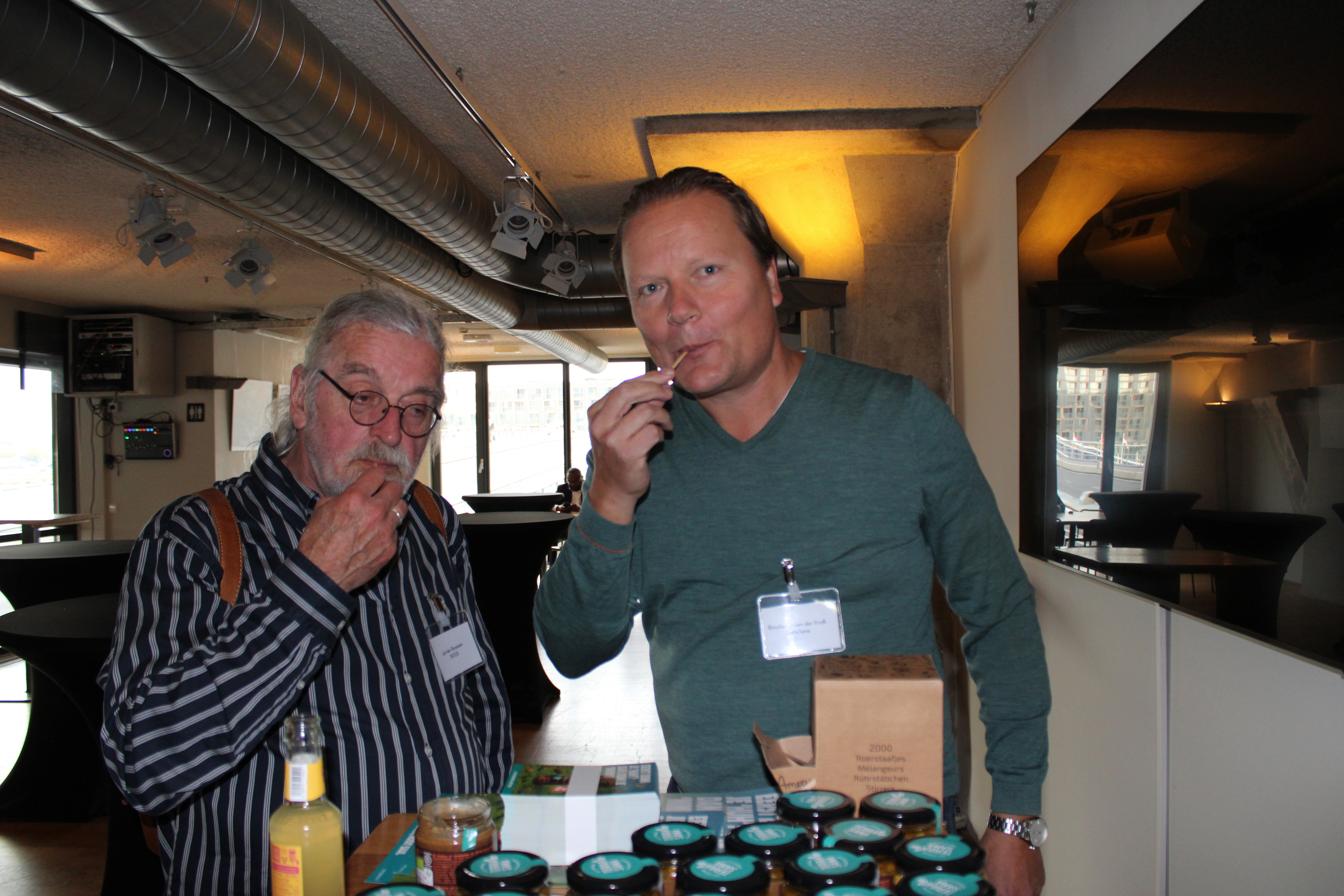 Jurrien Roossien van Roos en Boudewijn van der Kroft van TerraSana proeven de nieuwe Crunchy amandelpasta chai