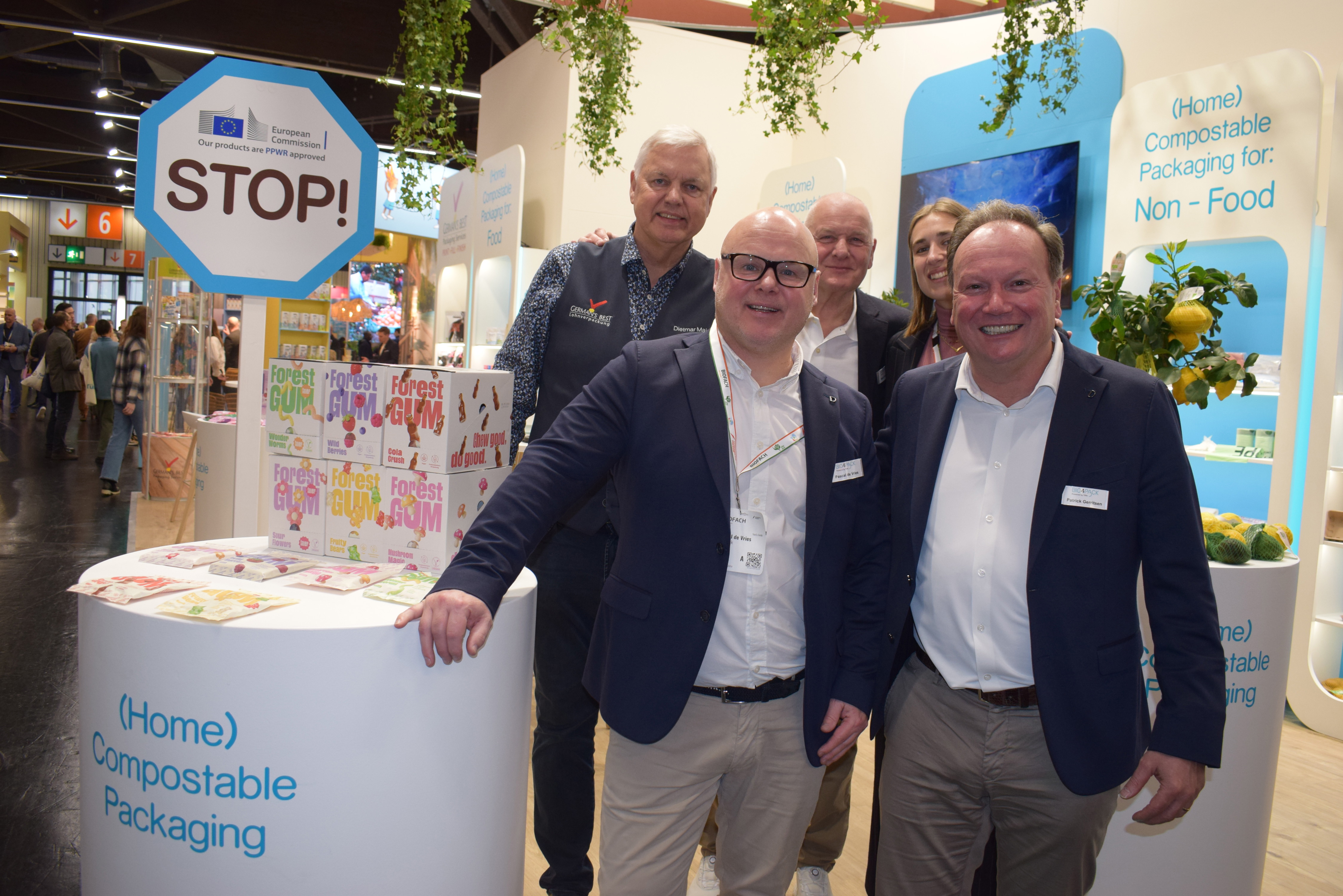 STOP bij Bio4Pack, want zij hebben oplossingen voor de Packaging and Packaging Waste Regulatio wetgeving (PPWR) die vanaf augustus gaat gelden: Pascal de Vries, Dietmar Maier, Mark Bevers, Patrick Gerritsen, Fredrica Riccio leggen het allemaal uit