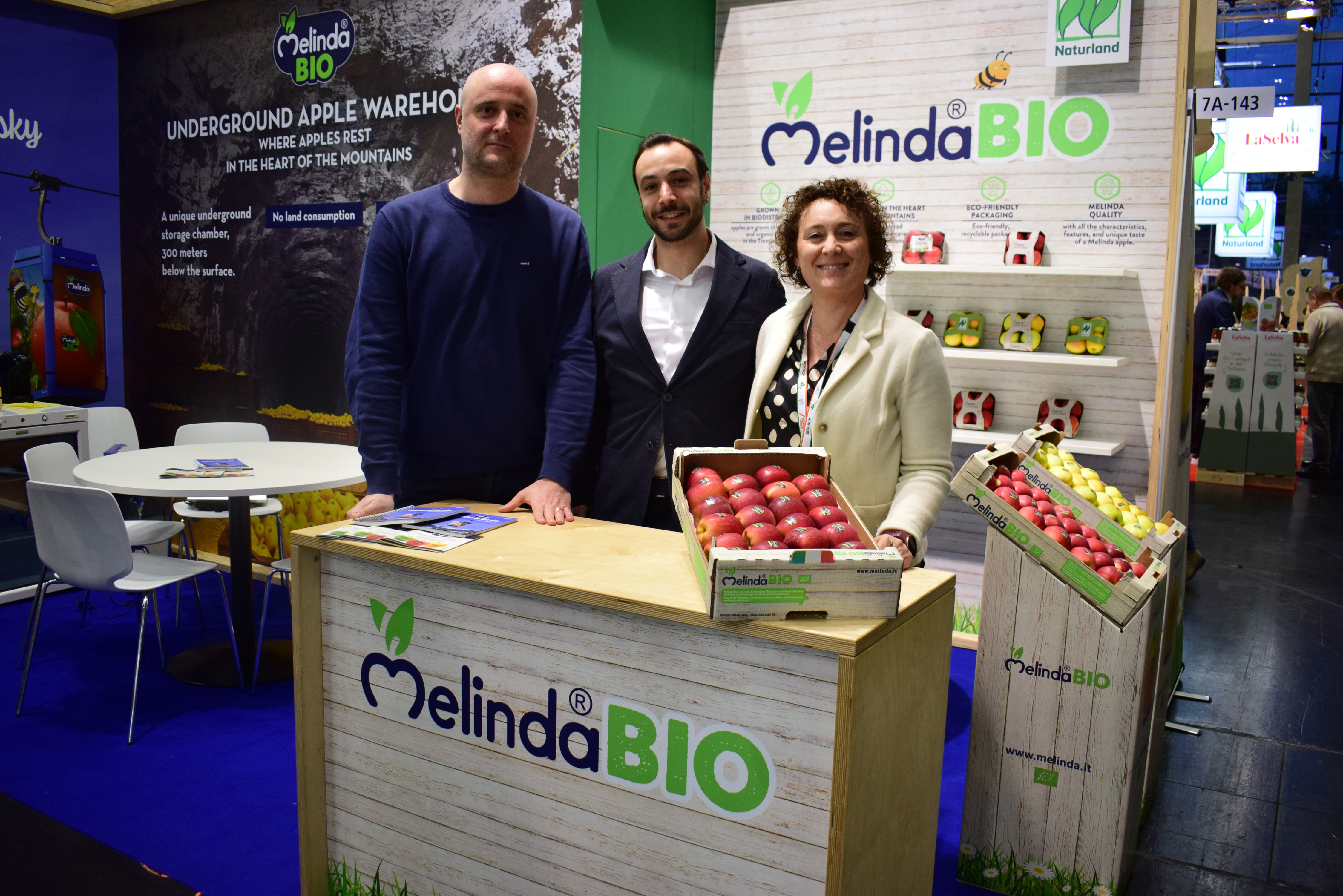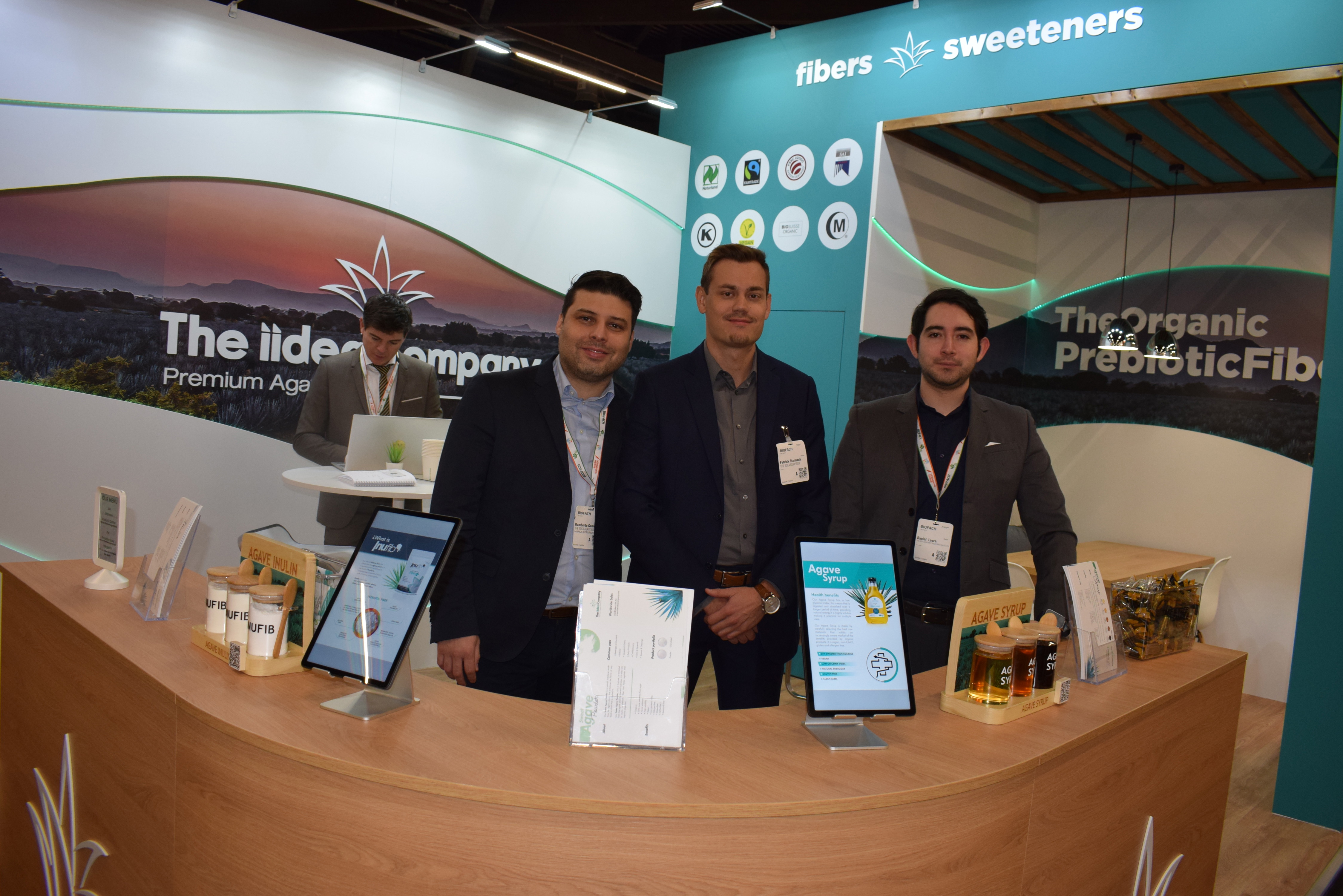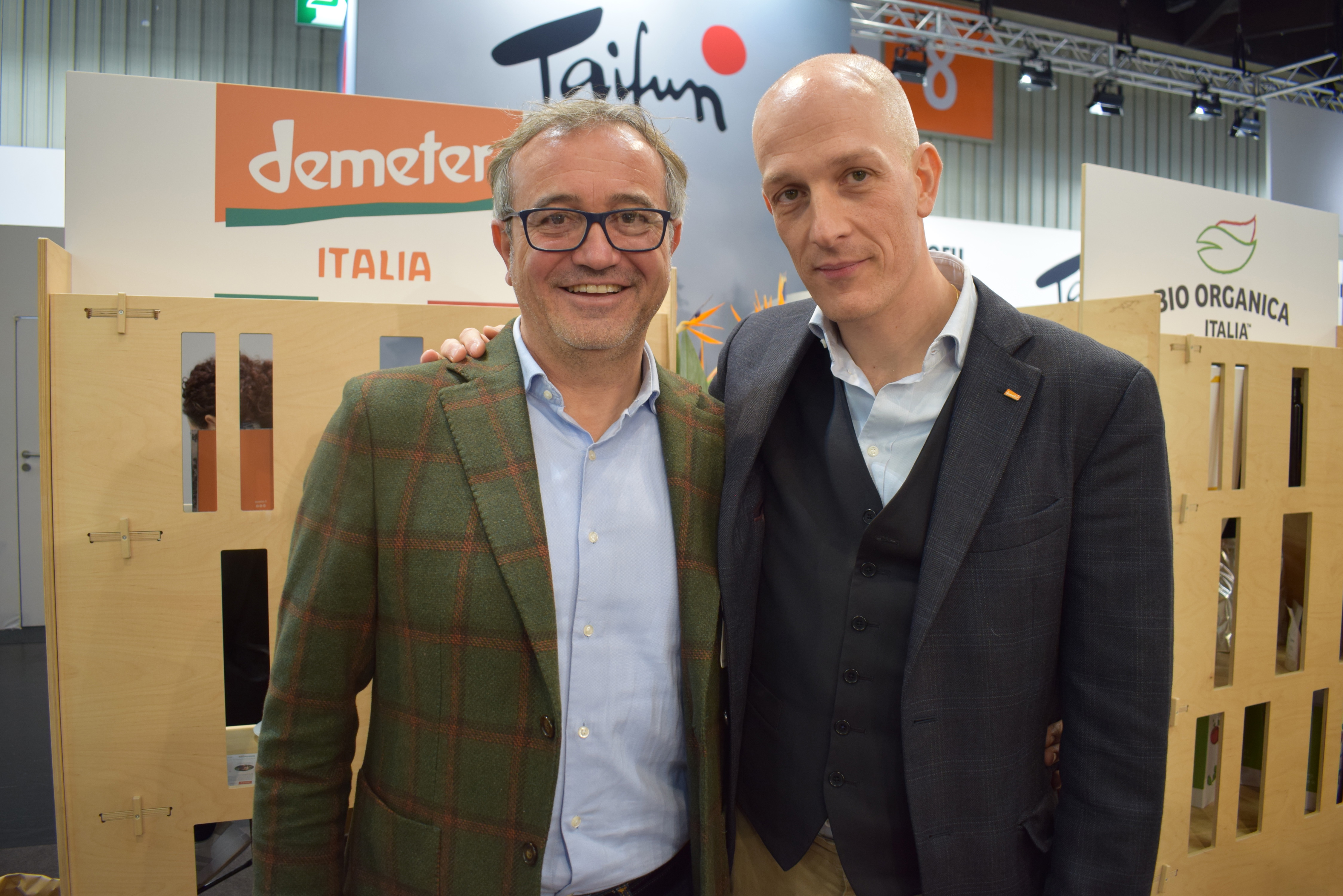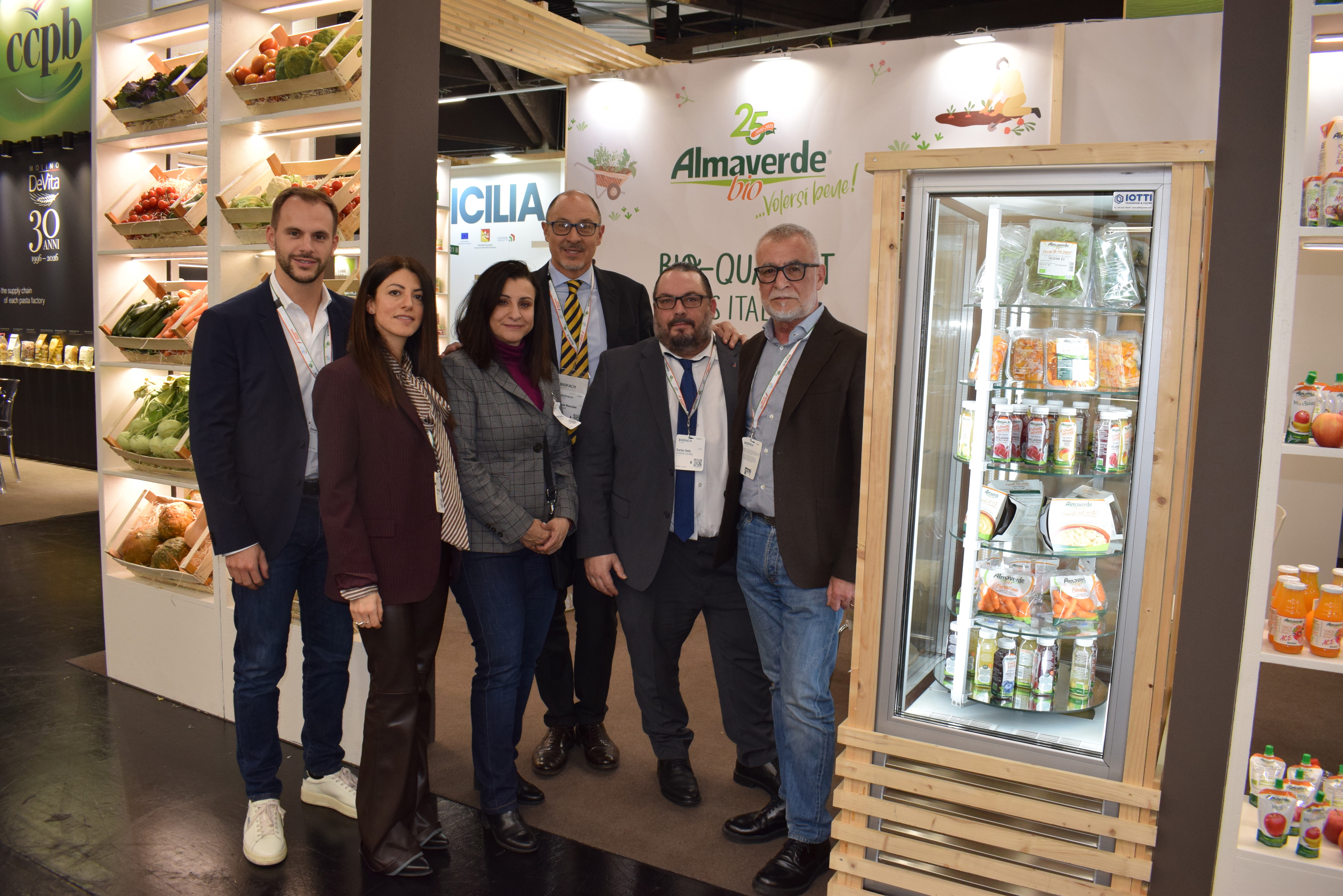 Op de stand van Almaverde Bio treffen we Monica Gonzalez en Carlos Soto, beiden van Canova Espagna, Simone Ambrogetti en Paolo Pari (Almaverde Bio) en Bruno Manzalini (Fruttage)