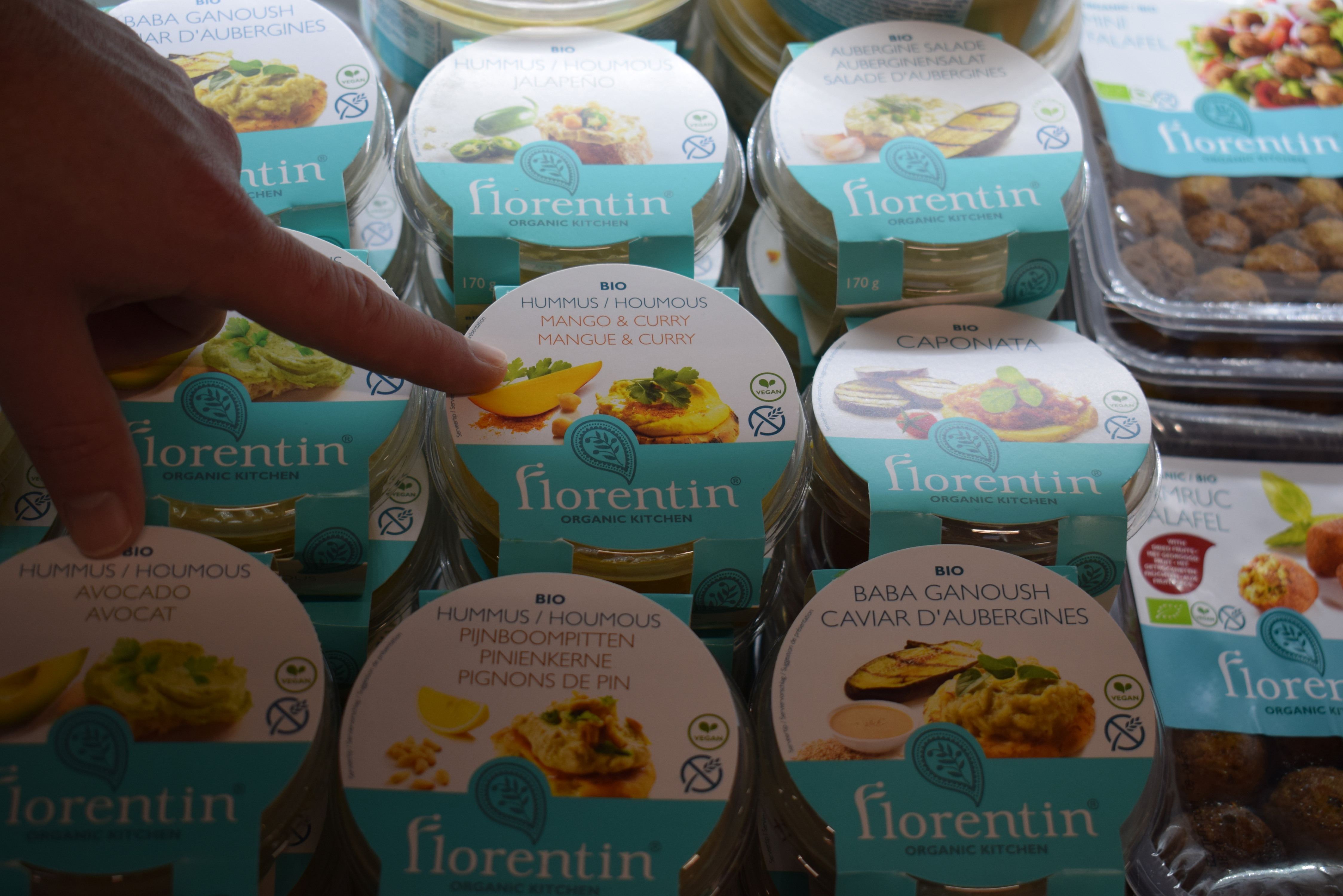 Nieuwe smaak hummus mango curry en ook nieuw is falafel van zoete aardappel
